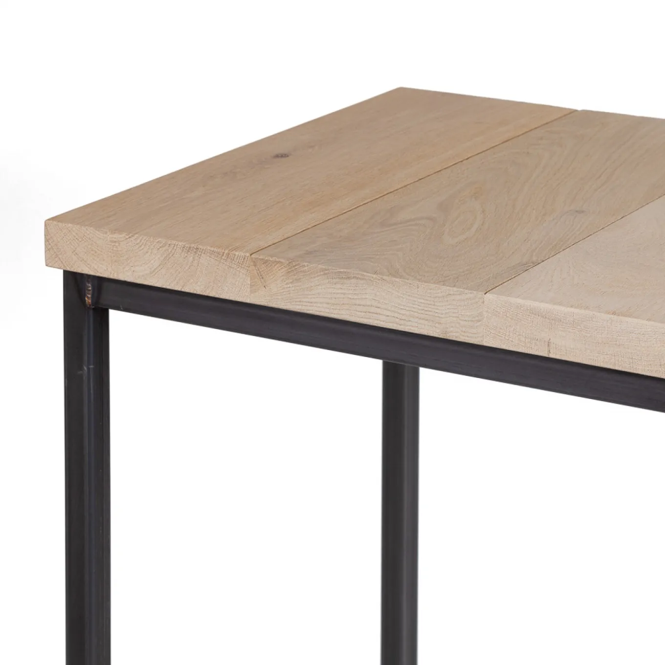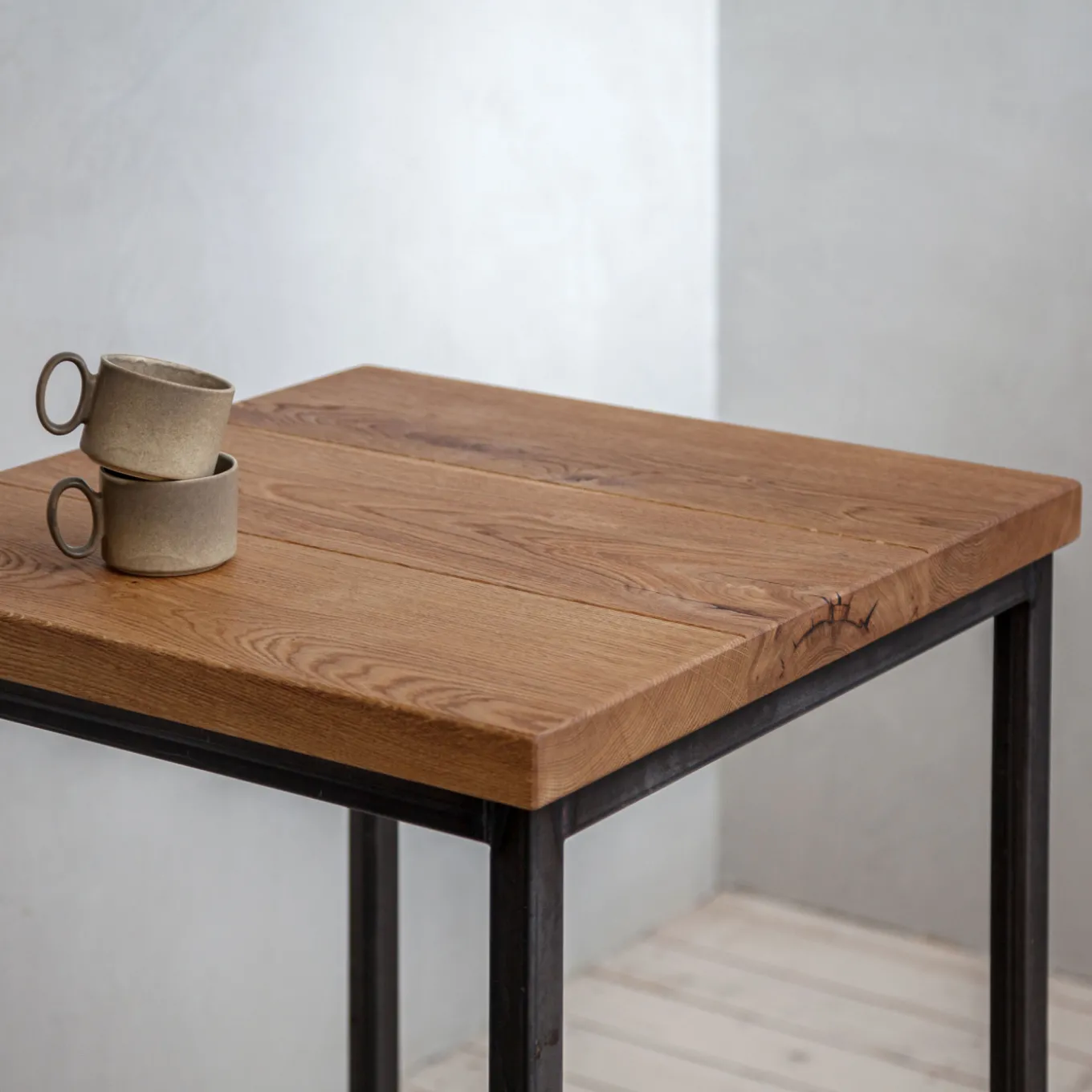 Du liebst es gesellig? Dann darf in deinem Zuhause ein Bartisch nicht fehlen. Der moderne Bartisch verbreitet aber nicht nur ein gemütliches Barfeeling in deiner Küche, sondern ist z.B. auch praktisch für das Frühstück am Morgen. Seinen einzigartigen Look bekommt der Tisch durch die Kombination aus Blankstahl und massiver, robuster Eiche. Die Oberfläche des Rohstahls ist mit mattem Klarlack behandelt. Die sichtbaren Schweißnähte verleihen dem Tisch seinen Industrial Style. Die Holzoberfläche ist in Handarbeit gebürstet. Zudem wird vor allem lebendiges Holz verarbeitet: Äste, Risse, Hobelschläge und Unebenheiten können enthalten sein. Somit wird jeder Bistrotisch zum Unikat. Und noch mehr du kannst die Höhe des Bistrotischs individuell bestimmen.