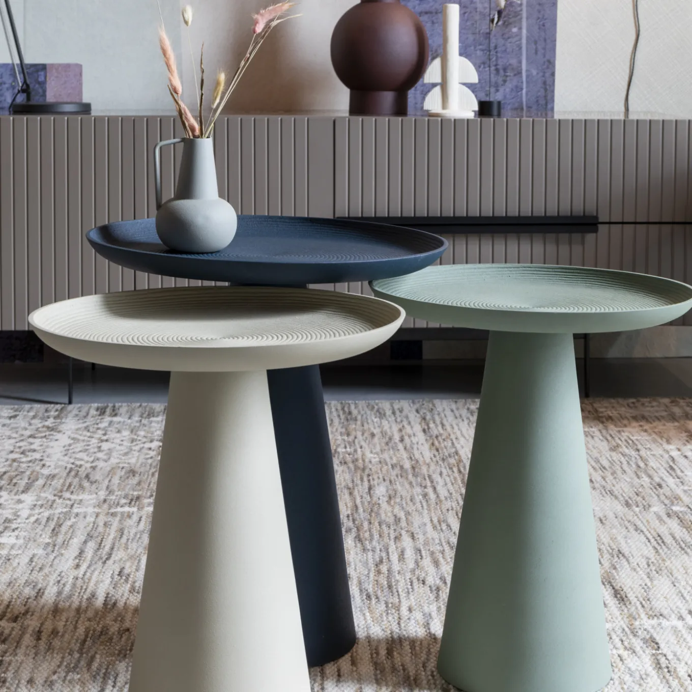 Die konische Basis sorgt für eine stabile Konstruktion, während die dezente Erhöhung am Rand der runden Tischplatte nicht nur ein optisches Highlight ist, sondern auch für zusätzliche Sicherheit sorgt. Perfekt für Deko-Elemente, Bücher oder als Ablage für Getränke.