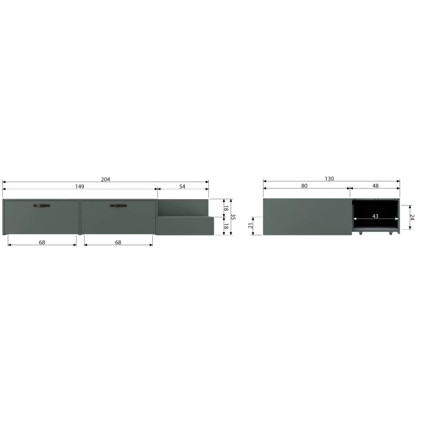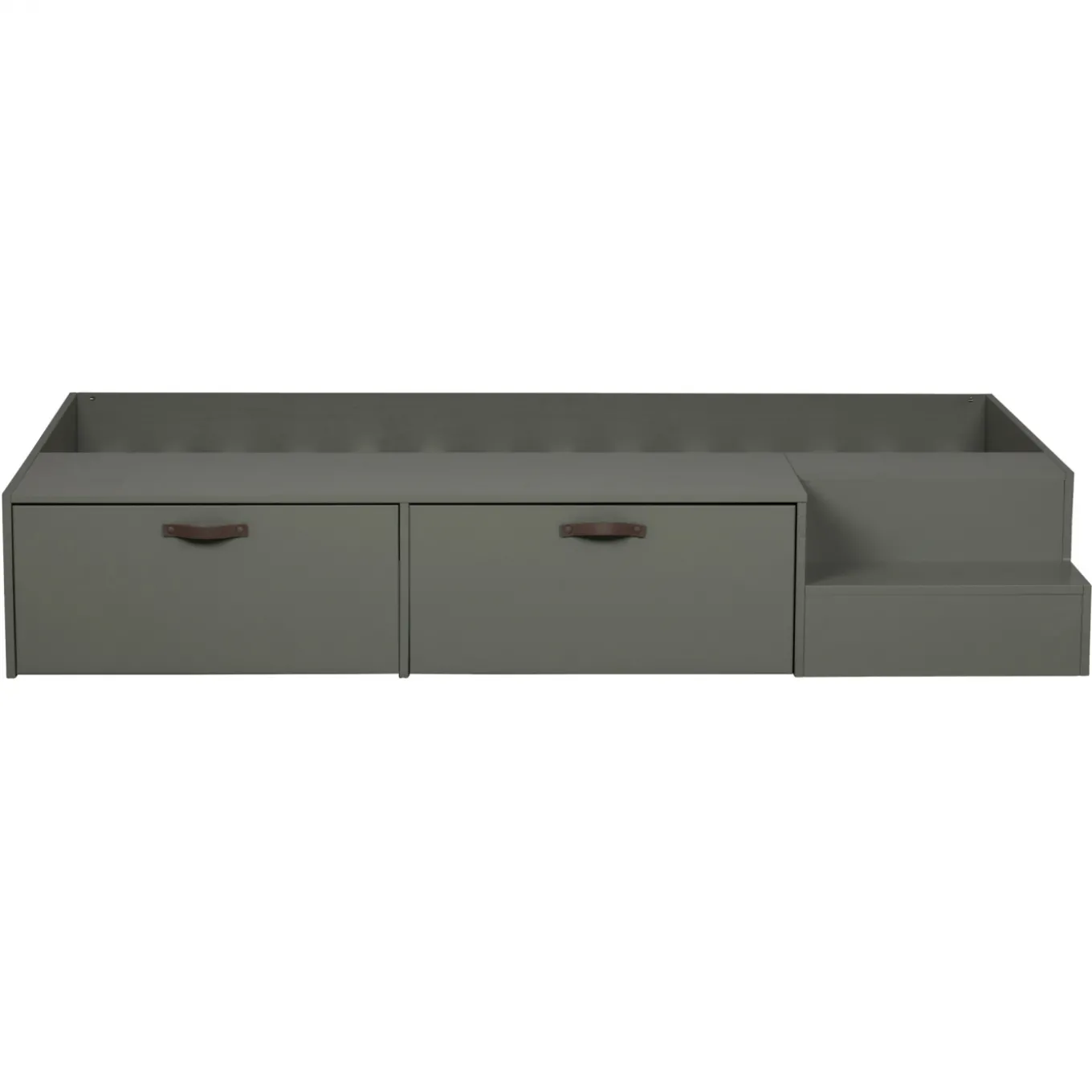 Das bequeme Bett verfügt über zwei Bettkästen, wo du allerlei Dinge verstauen kannst. Die Schubladen haben eine Breite von 64 cm, eine Höhe von 24 cm und eine Tiefe von 43 cm und sind mit Rädern ausgestattet, so dass auch Kinder sie leicht öffnen und schließen können. Die beiden Stufen zum Einsteigen ins „Stage Bett“ sind 18 cm hoch. Neben der Matratze ist eine Holzkante (48 cm breit), wo Bücher, Lampe und Co. platziert werden können. Die braunen Ledergriffen sorgen für den robusten und lässigen Look!