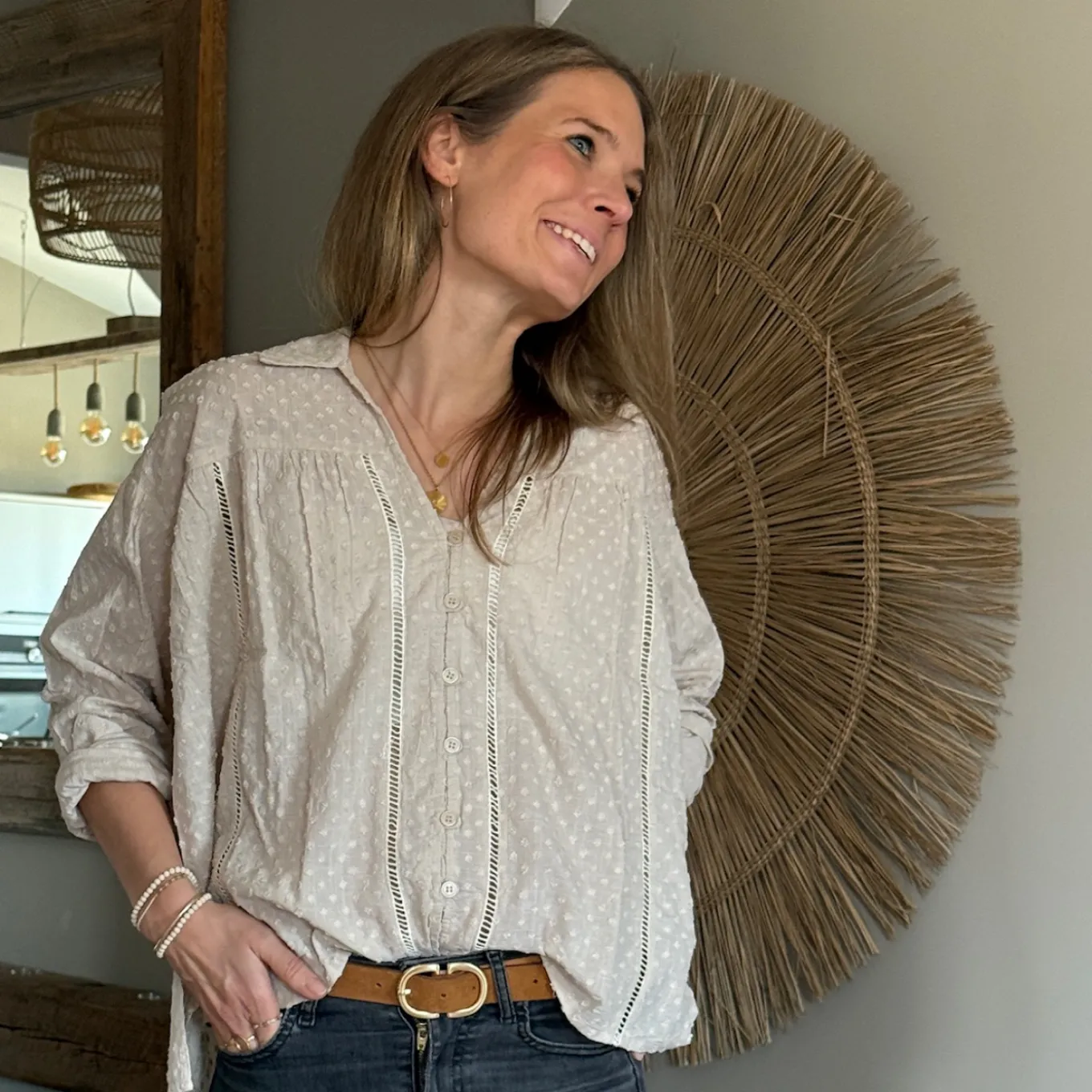 Leicht, lässig und voller Natürlichkeit – diese beigefarbene Baumwollbluse von Wohnlust ist ein echtes Wohlfühlteil für jeden Tag. Der lockere Schnitt, die zarte Webstruktur und die sanfte Farbe machen sie zu einem unkomplizierten Begleiter für deinen Alltag – ob zur Jeans, zu Leinenhosen oder über deinem Lieblingskleid.