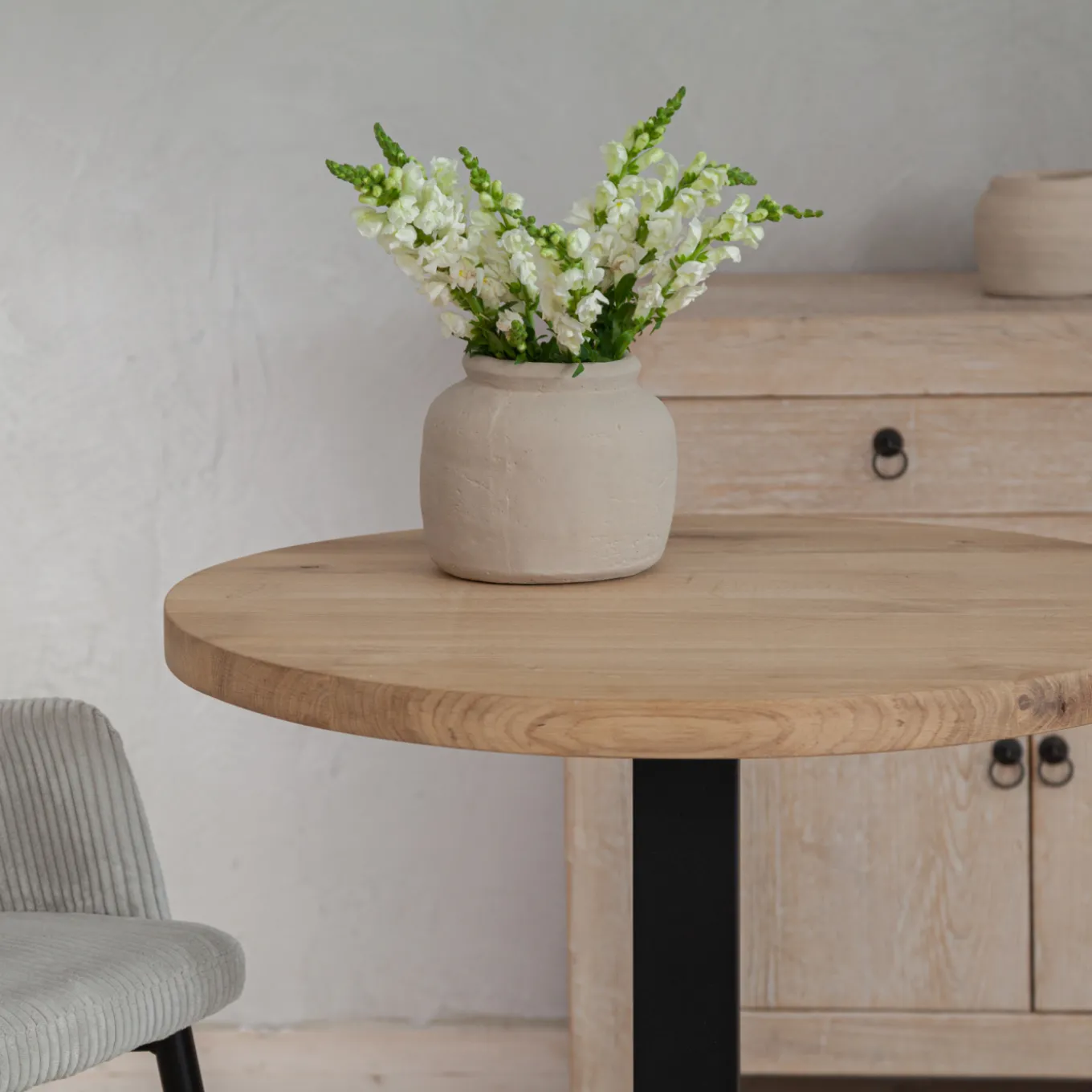 Natürlich und modern: Dieser moderne Café Tisch findet überall einen gemütlichen Platz. Wir lieben es an dem kleinen Tisch gemütlich zu frühstücken und unseren morgendlichen Kaffee zu genießen. Der Tisch eignet sich perfekt für kleine Küchen oder gemütliche Ecken in deinem Zuhause. Seinen einzigartigen Look bekommt der kleine Esstisch durch die Kombination aus Stahl und massiver, robuster Eiche. Die Oberfläche des Stahls ist schwarz matt lackiert und die Holzoberfläche in Handarbeit gebürstet. Zudem wird vor allem lebendiges Holz verarbeitet: Äste, Risse, Hobelschläge und Unebenheiten können enthalten sein. Somit wird jeder Tisch zum Unikat!