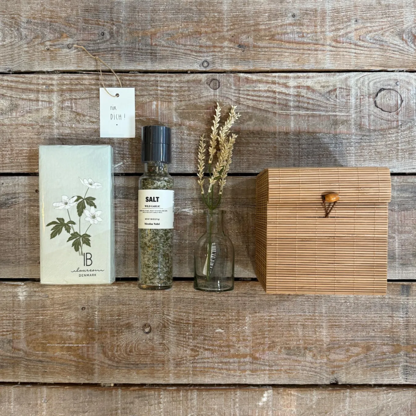 Ob für Freunde, Familie oder als kleine Belohnung für sich selbst – dieses Set bringt Freude und Wertschätzung zum Ausdruck. Die edlen Servietten und das Apothekerglas sorgen für eine gemütliche Atmosphäre, während das feine Gewürz jede Mahlzeit verfeinert.
