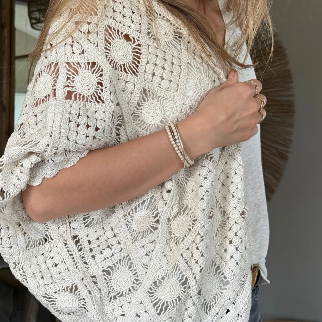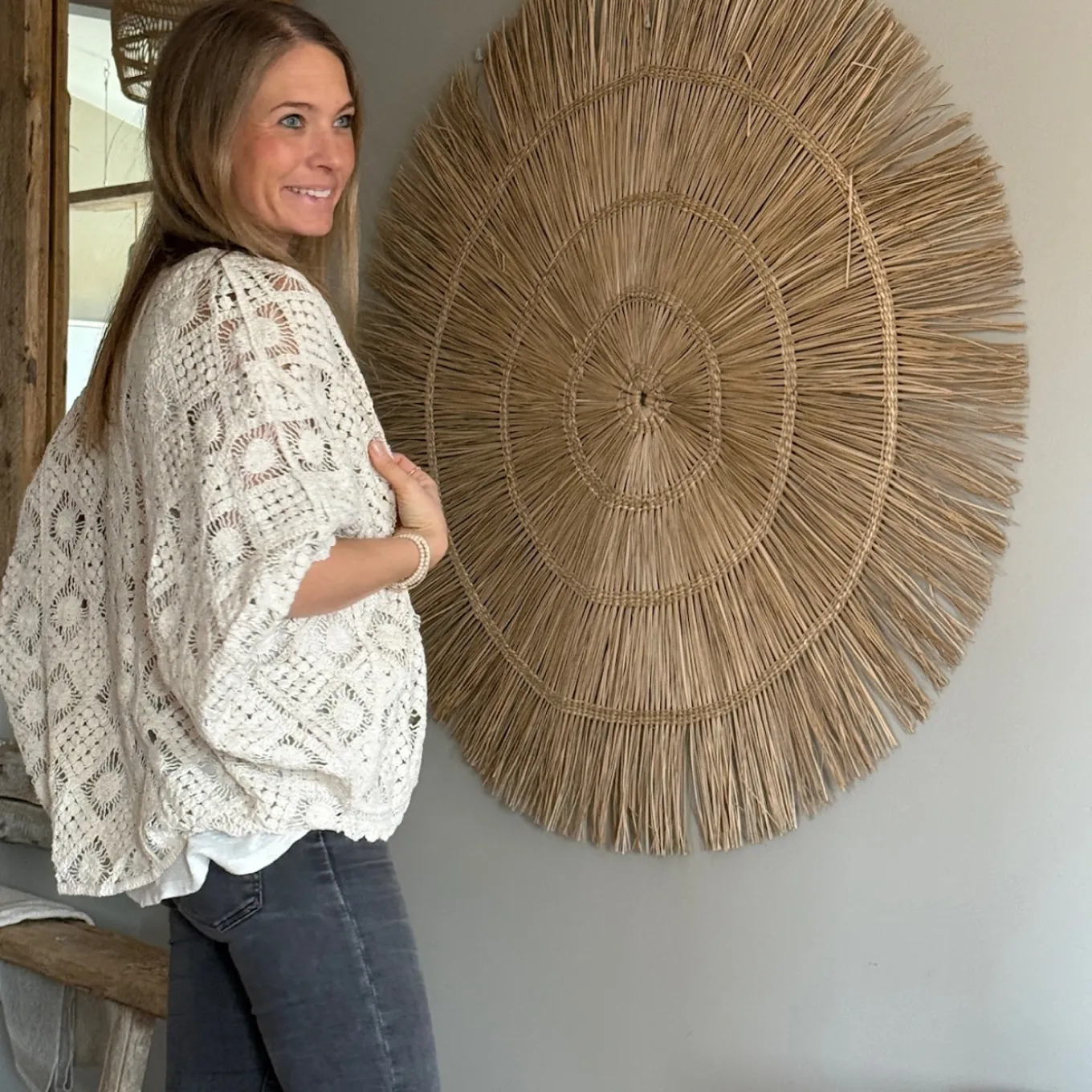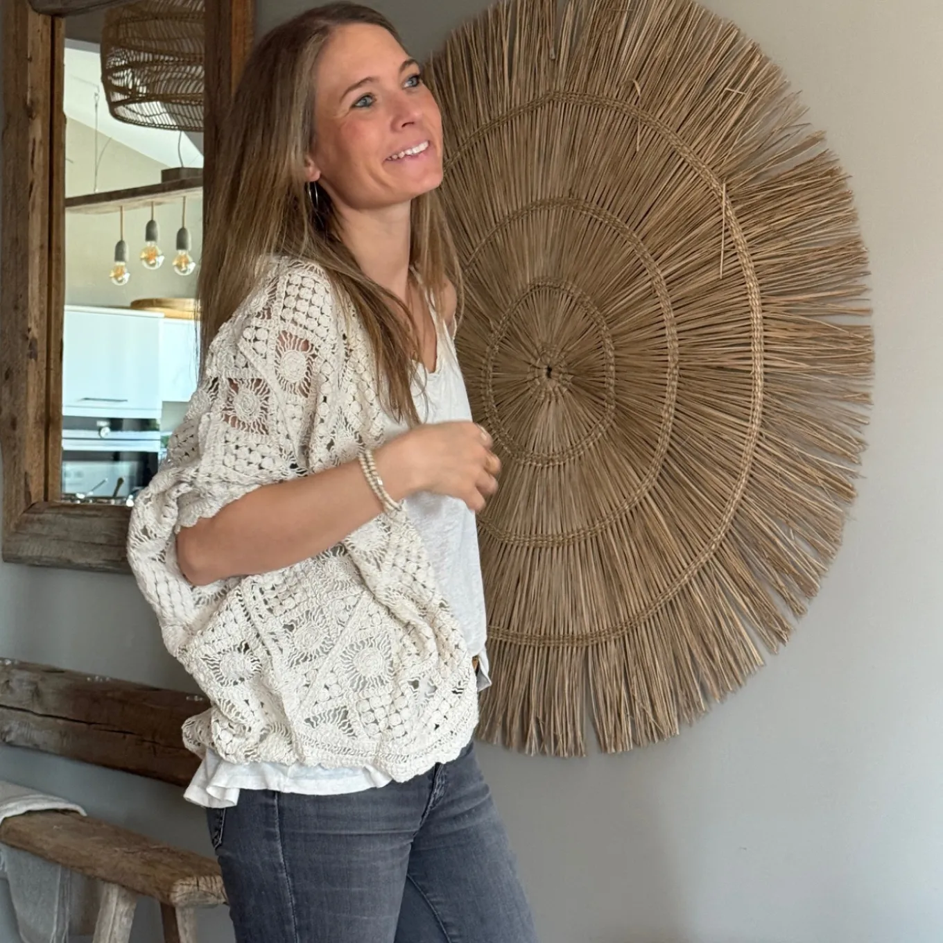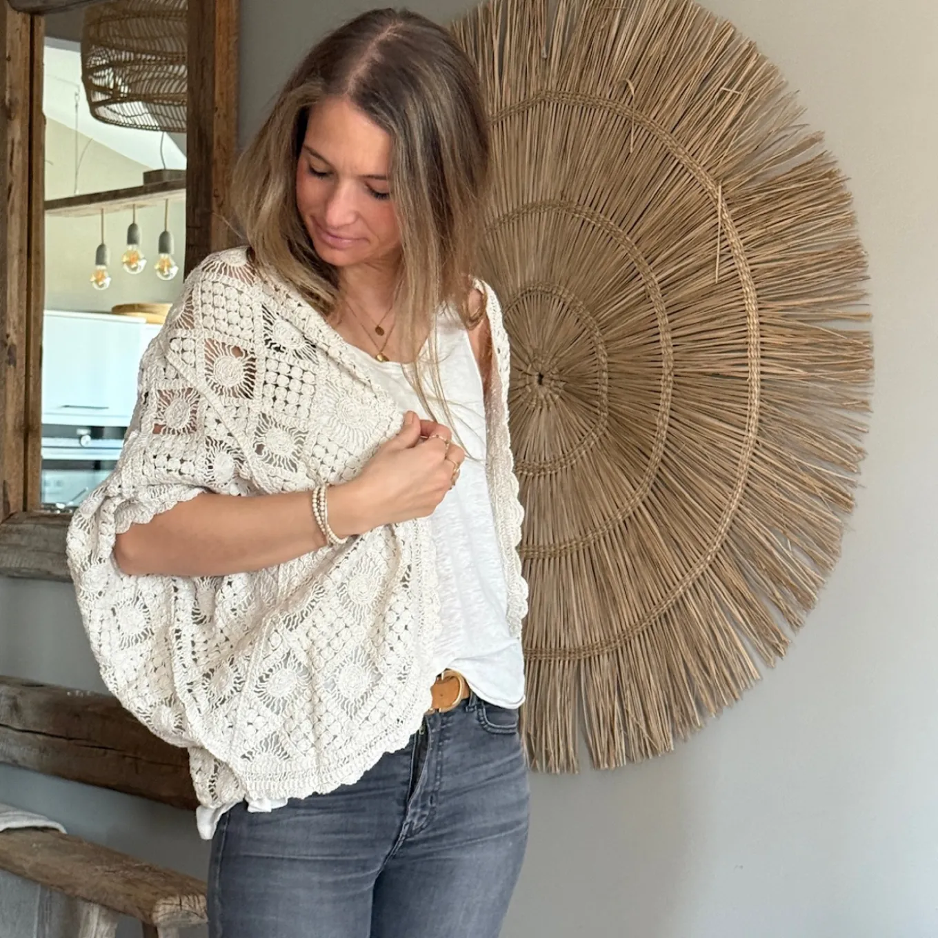 Diese Häkeljacke in zartem Creme ist ein echtes Schmuckstück für deine Garderobe. Mit ihrem detailverliebten Muster, der luftigen Struktur und dem leichten Fall bringt sie romantischen Boho-Charme in jedes Outfit. Ob als stilvolle Ergänzung über Kleidern, zur Jeans oder als Eyecatcher an warmen Frühlingstagen – diese Jacke verleiht deinem Look Leichtigkeit und Individualität.