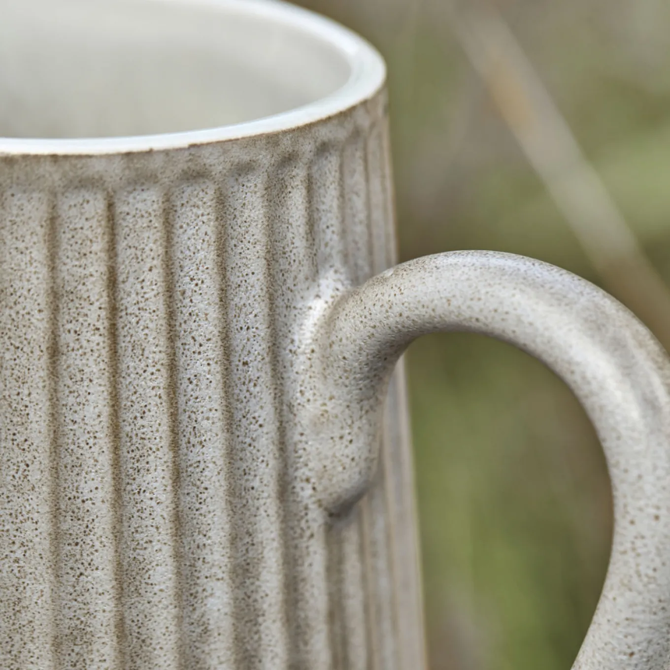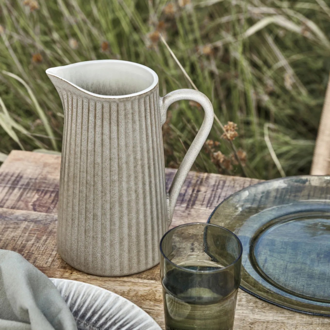 Serviere deinen Frühstückssaft oder Wasser in der stilvollen Kanne mit geriffeltem Look. Die matte Außenseite und die glänzende Innenseite verleihen deinem Tisch einen dezent eleganten Touch, besonders in Kombination mit schlichtem Alltagsgeschirr. Doch diese Kanne kann noch mehr – nutze sie auch als Vase für Blumen aus dem Garten und bringe eine natürliche Note in dein Zuhause.