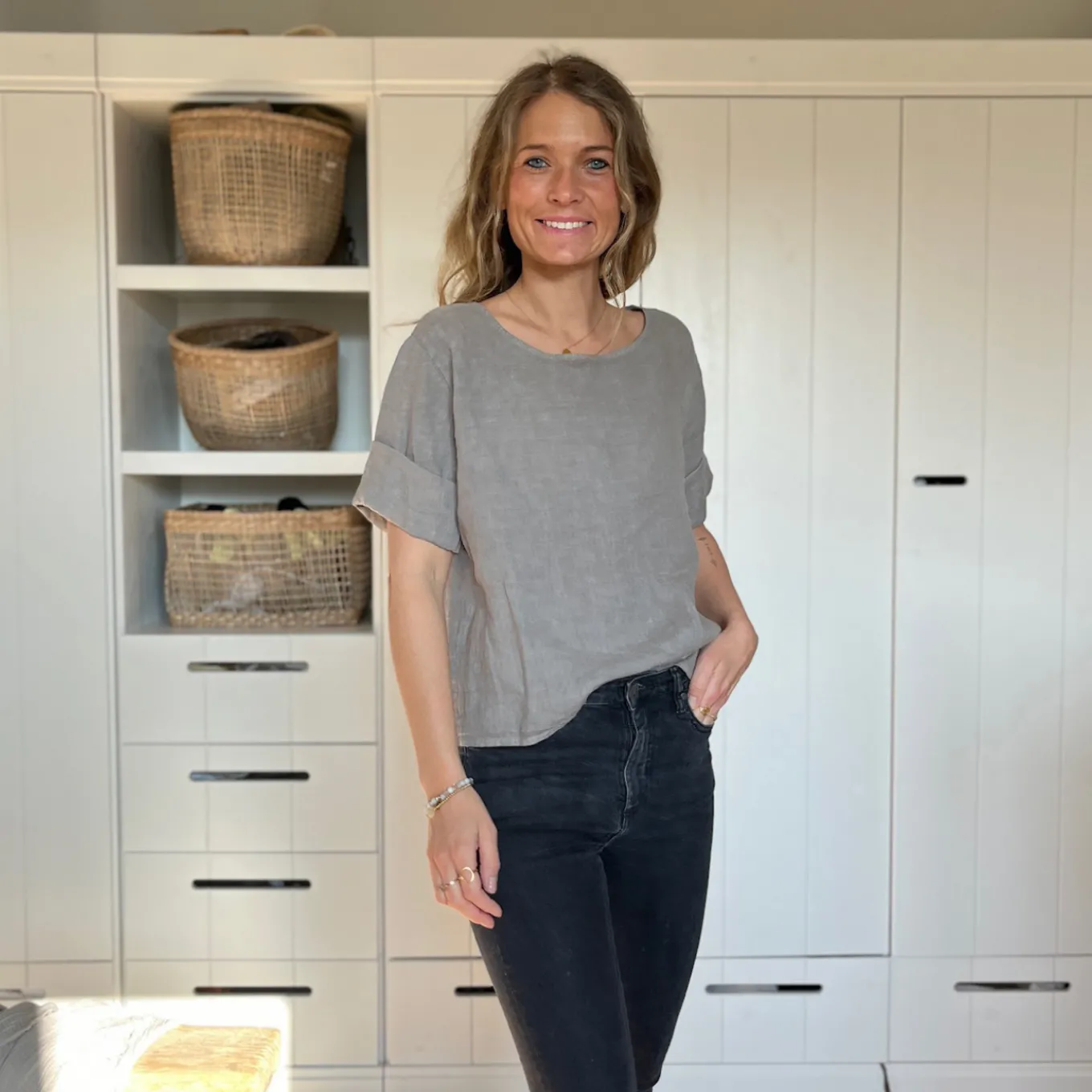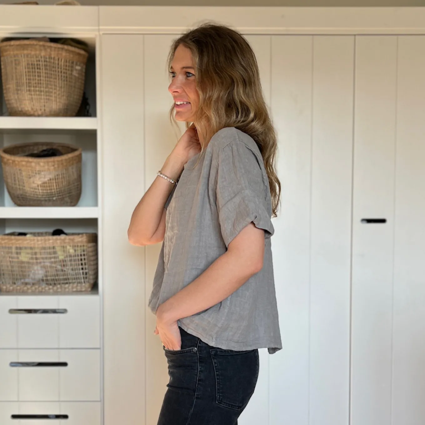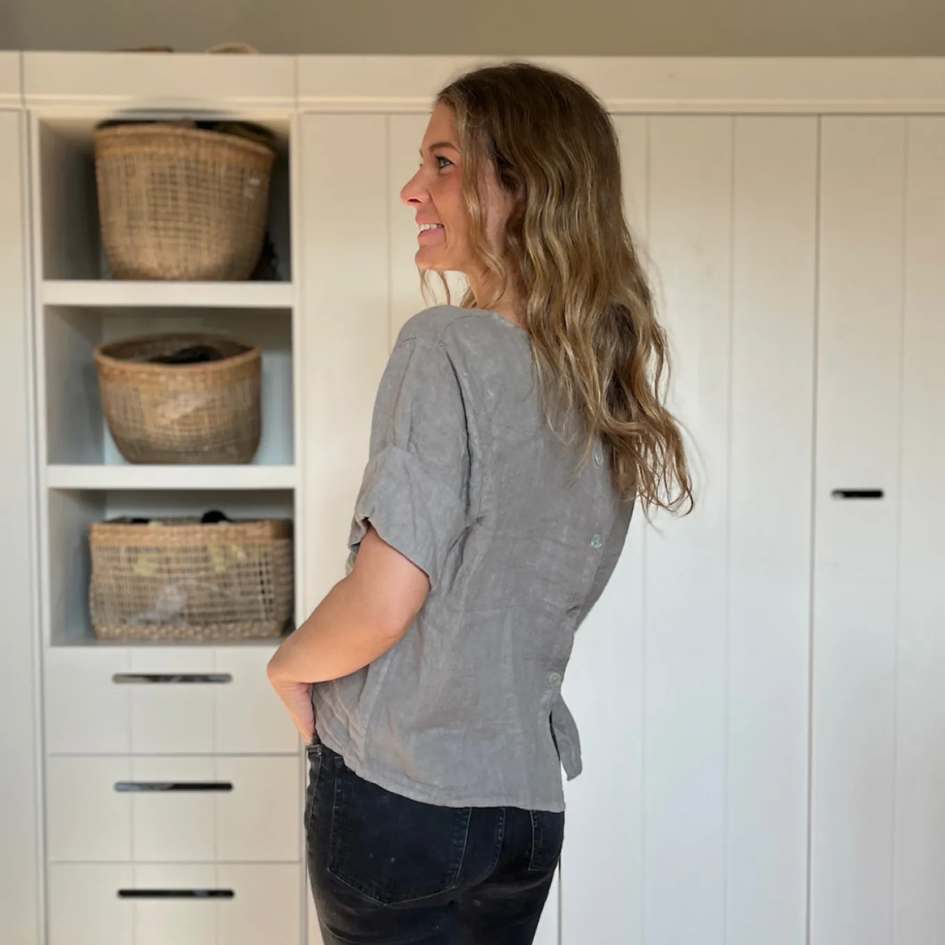 Dieses kurzärmlige Shirt aus 100% Leinen ist einfach nur schön. Das besondere: die Knopfleiste am Rücken. Das perfekte Basic für den Frühling und Sommer.