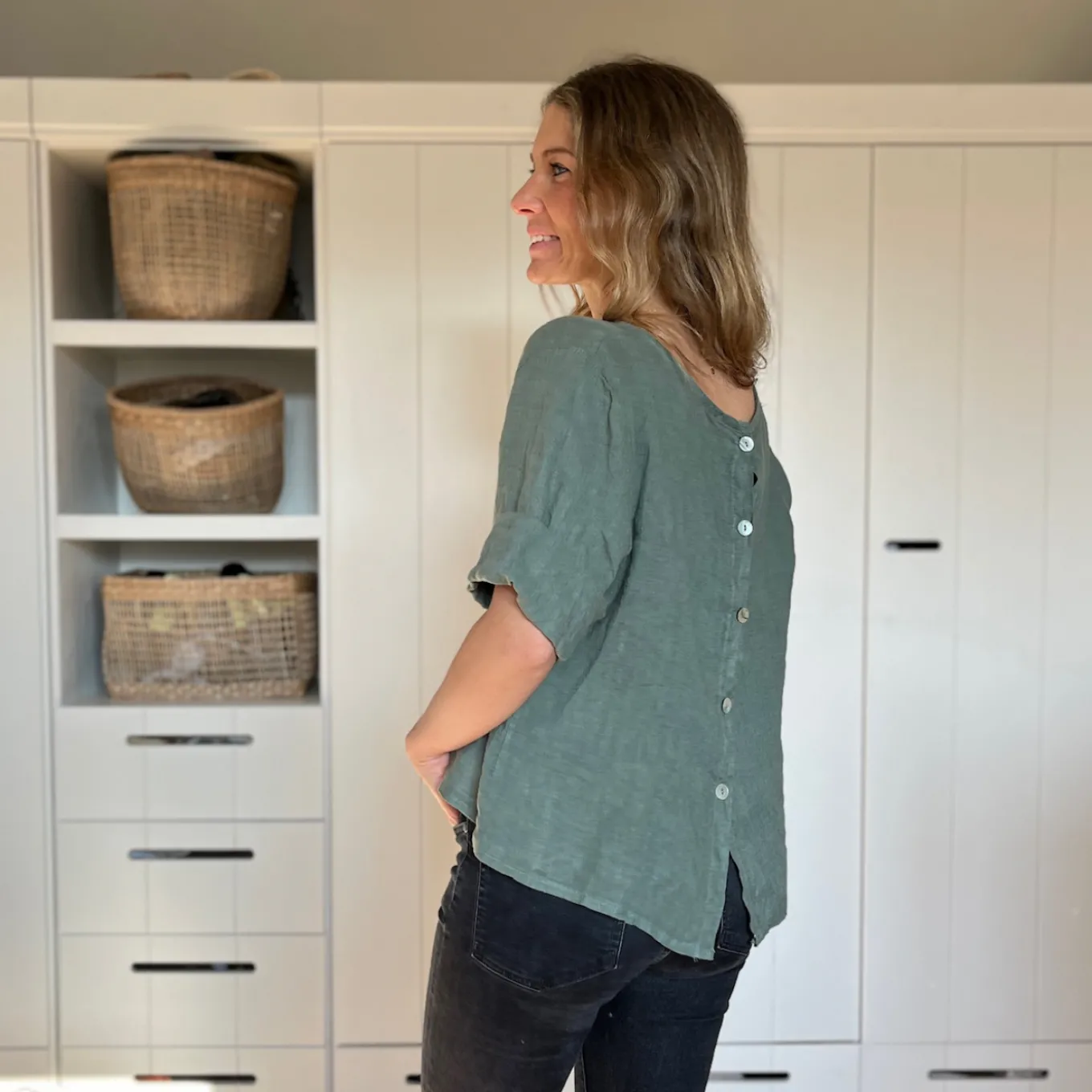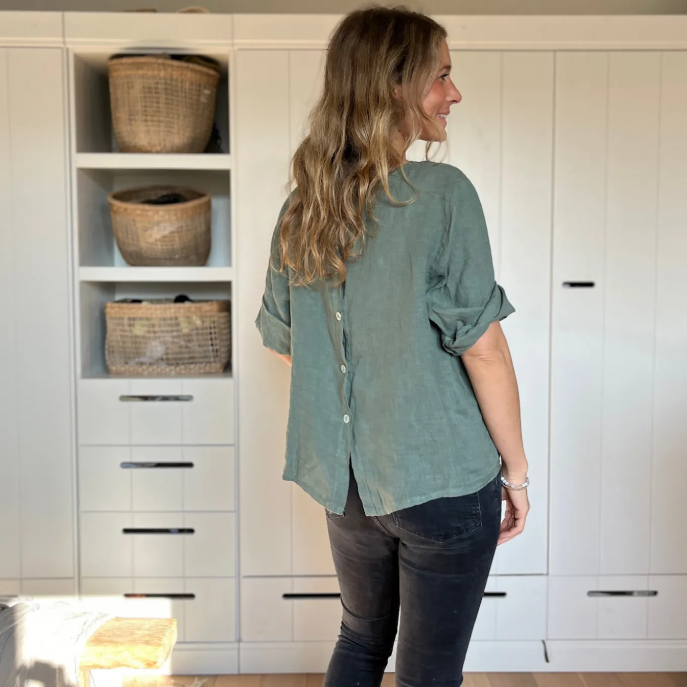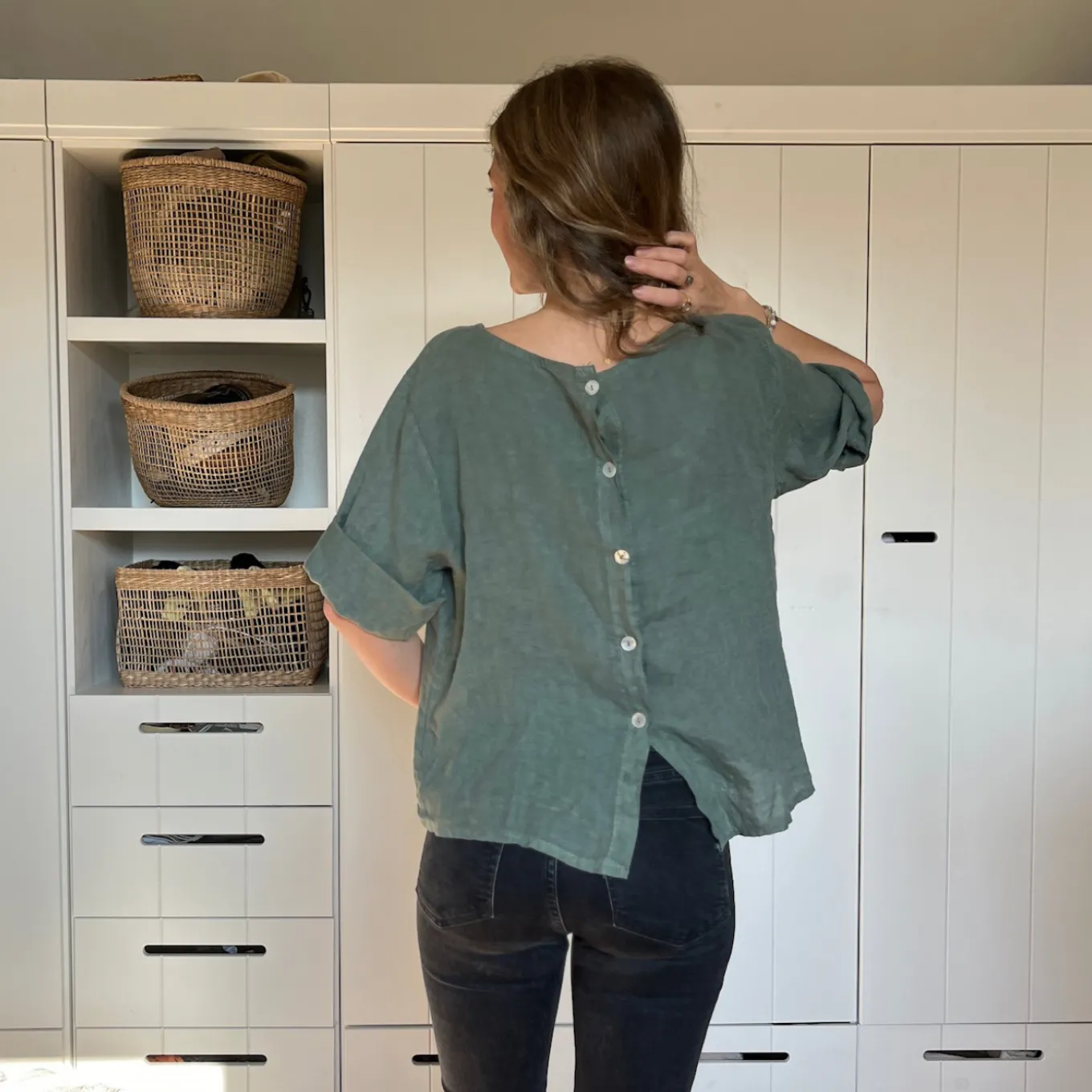 Dieses kurzärmlige Shirt aus 100% Leinen ist einfach nur schön. Das besondere: die Knopfleiste am Rücken. Das perfekte Basic für den Frühling und Sommer.