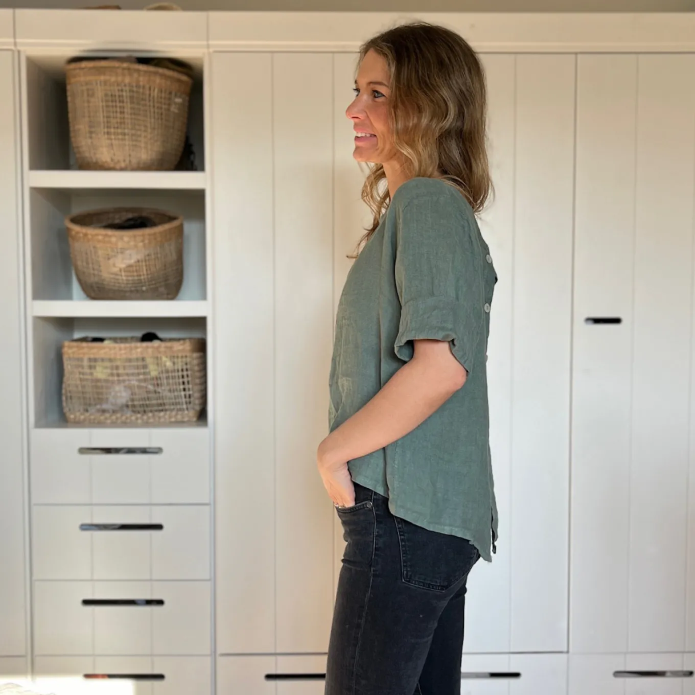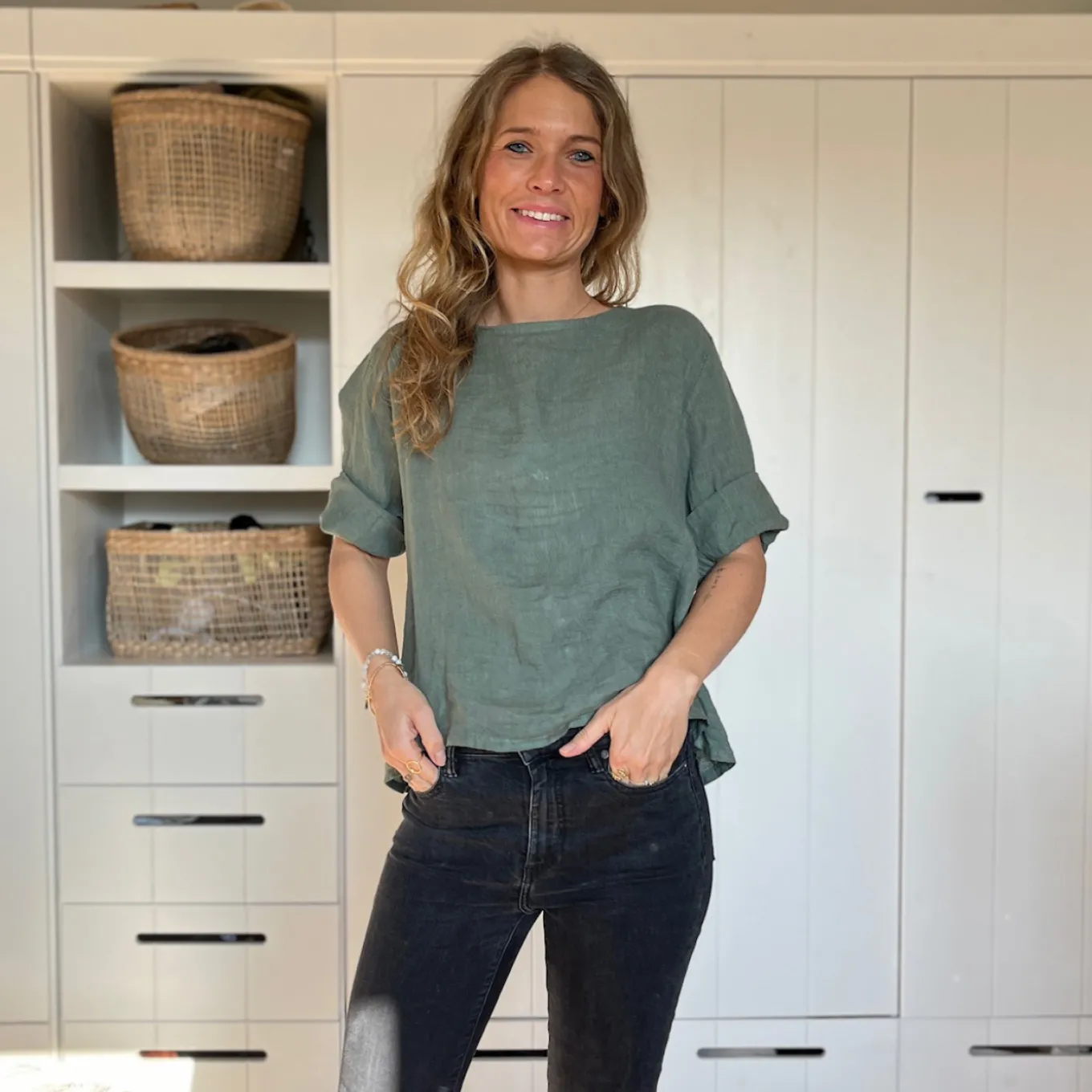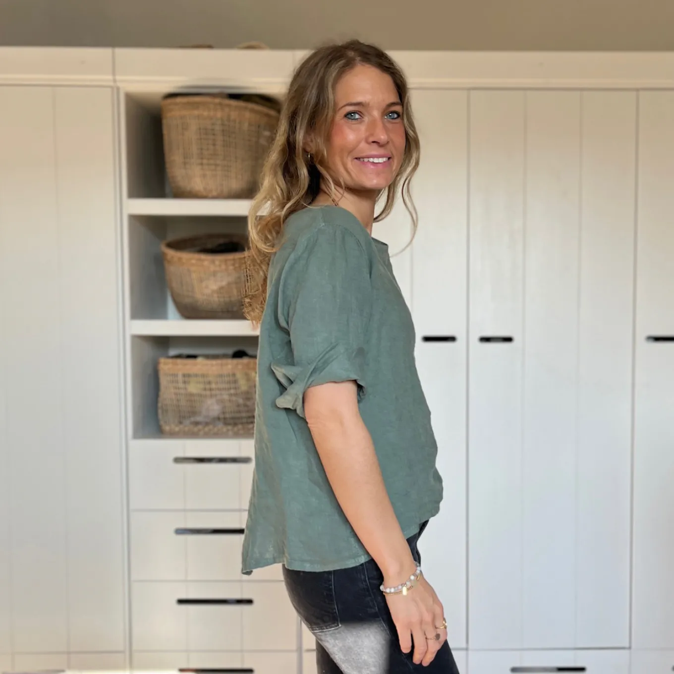 Dieses kurzärmlige Shirt aus 100% Leinen ist einfach nur schön. Das besondere: die Knopfleiste am Rücken. Das perfekte Basic für den Frühling und Sommer.