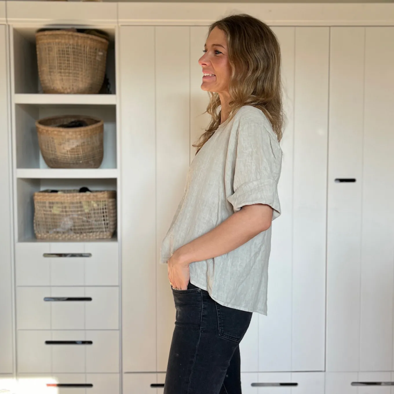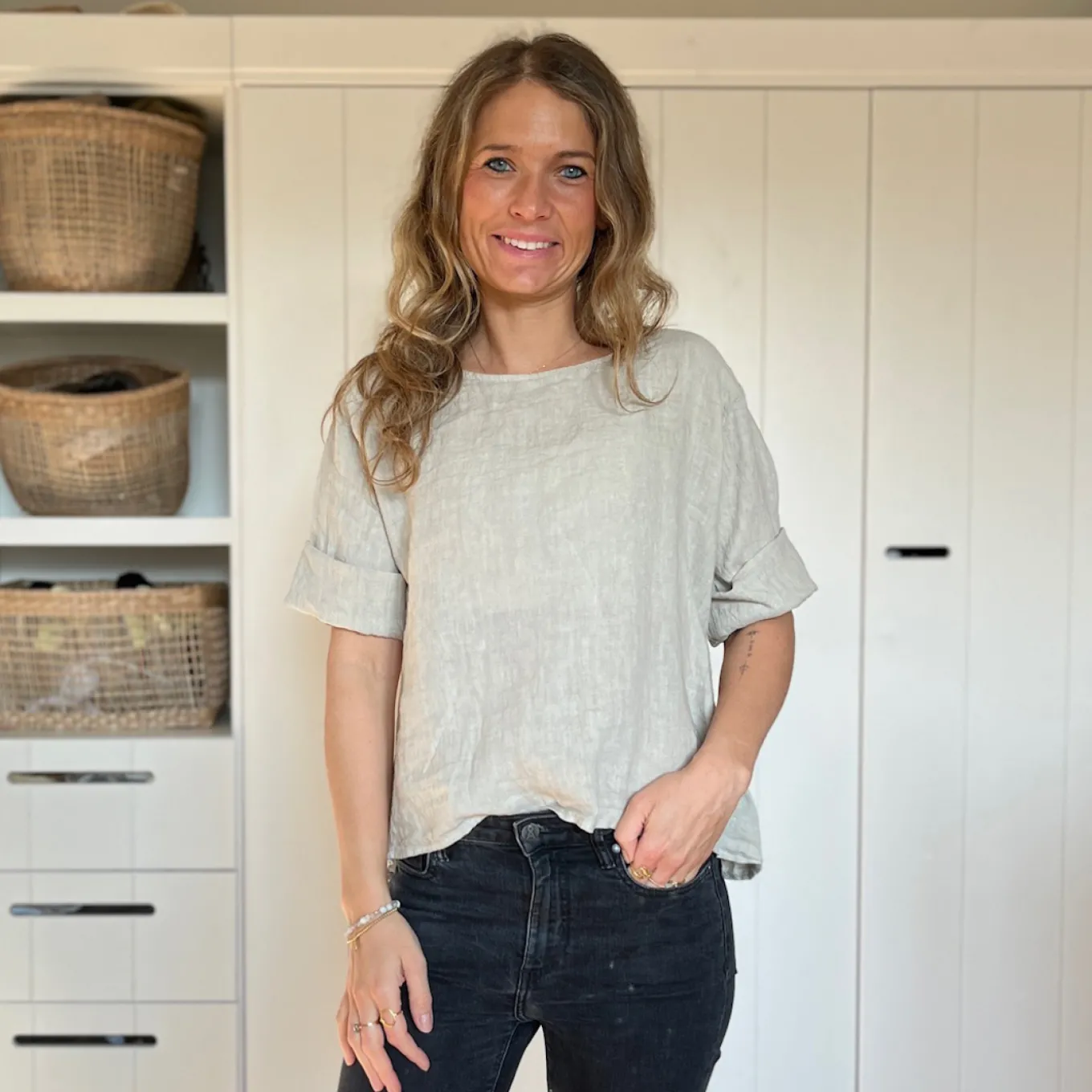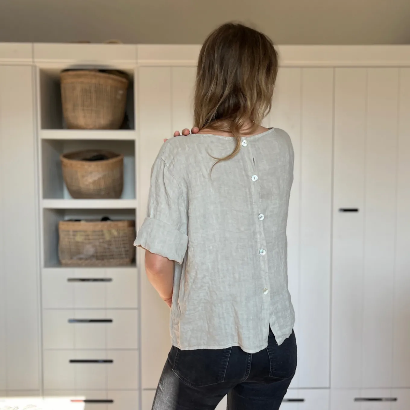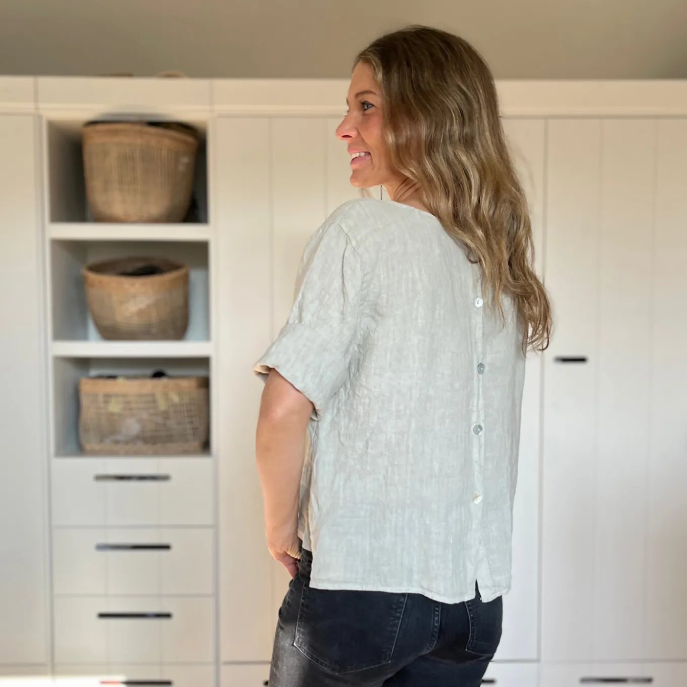 Dieses kurzärmlige Shirt aus 100% Leinen ist einfach nur schön. Das besondere: die Knopfleiste am Rücken. Das perfekte Basic für den Frühling und Sommer.