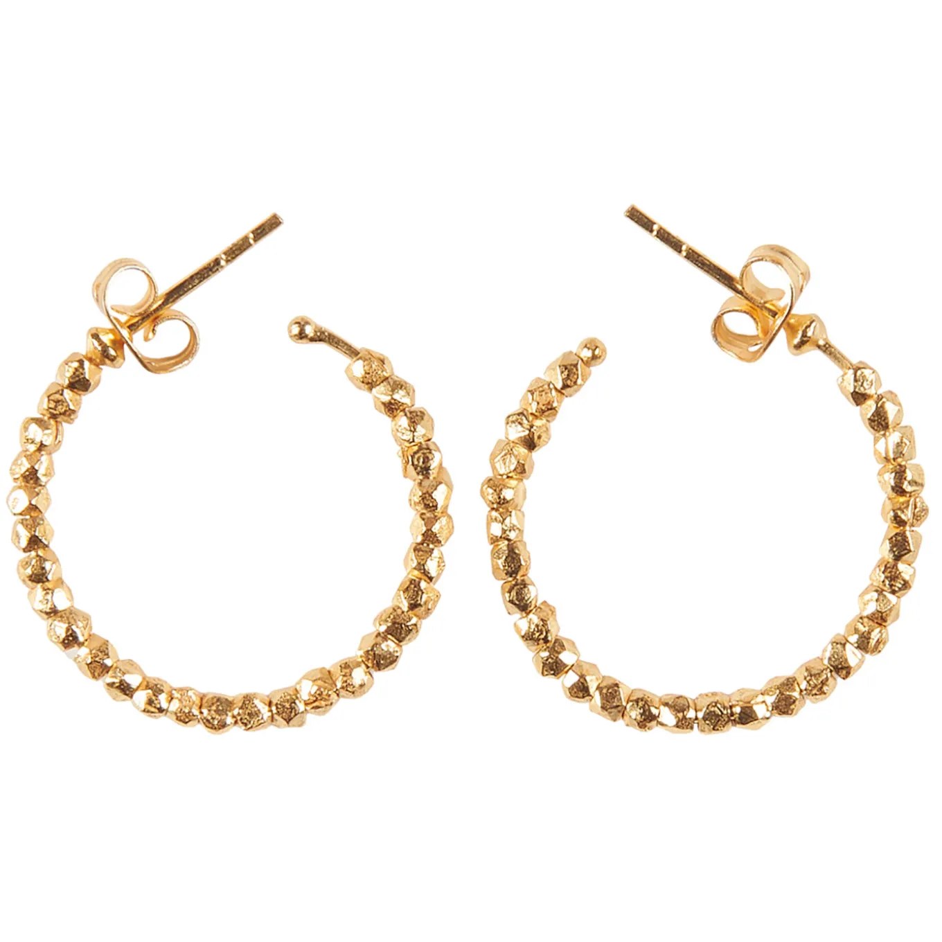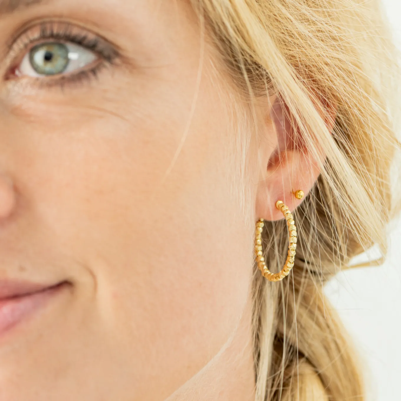 Die feinsten Creolen-Ohrringe mit kleinen, grob geschliffenen Perlen. Die Ohrringe sind aus Messing gefertigt und mit 18-karätigem Gold überzogen. Vermeide es, die Ohrringe nass zu machen und trage sie nicht im Schwimmbad. Die beste Art, die Ohrringe aufzubewahren, ist in einem luftdichten Behälter.