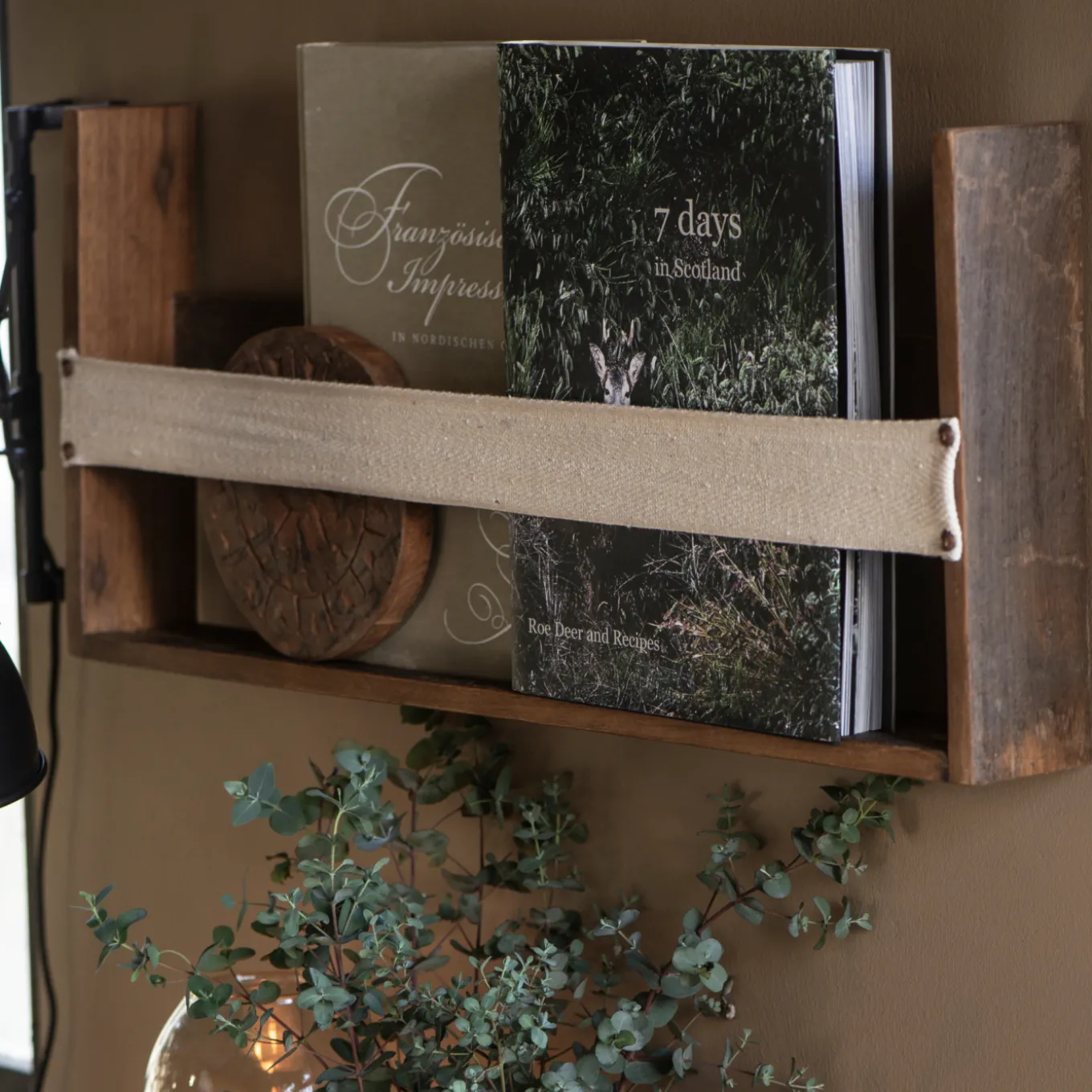 Wohnmagazine, Rezepte, Untersetzer – mit diesem einmaligen Holzregal hast du alles griffbereit. Das Regal aus Recycling-Altholz und Baumwolle ist einfach so traumhaft schön und noch dazu ein echter Blickfang. Hinter dem Möbelgurt aus Baumwolle kannst du eigentlich alles Mögliche klemmen, aber am besten eignet sich das Regal für Magazine und Zeitungen. Jedes Regal ist ein Einzelstück und das Holz unterscheidet sich durch Knorren, Risse, Sprünge. Splitter und die Holzart!