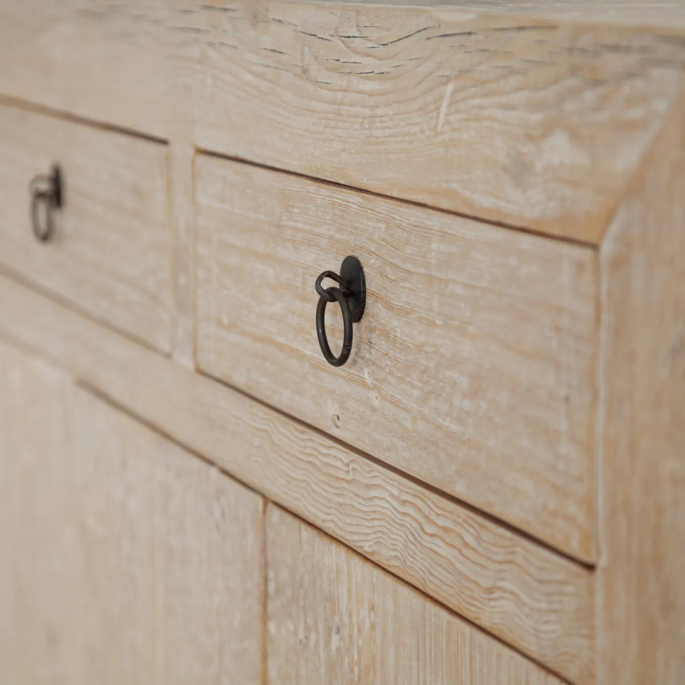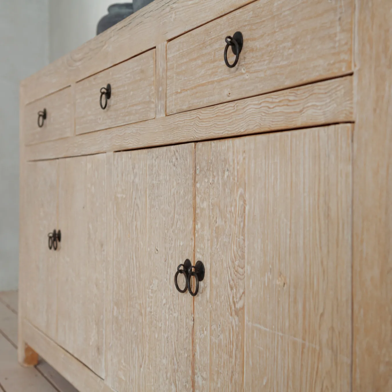 Dieses massive Sideboard aus Kiefernholz bietet viel Stauraum. In drei Schubladen und hinter vier Türen ist Platz für all deine Sachen. Die Schubladen und Türen lassen sich mit eleganten, schwarzen Ringen öffnen. Das Kiefernholz ist naturbelassen und unbehandelt.