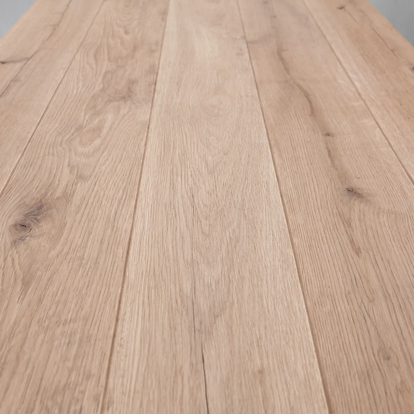 Wie soll die Oberfläche der Tischplatte behandelt werden? Du hast die Wahl. Du magst es weniger robust? Auf Wunsch können Äste und Risse gespachtelt werden. Zudem kannst du zwischen zwei Oberflächenbehandlungen wählen: Roh oder Natur. Die Roh-Optik ist hell und sieht aus wie Eiche im unbehandelten, frisch gehobelten Zustand. Die Natur-Optik ist etwas dunkler, dadurch wird die Holzmaserung und Äste besonders betont.