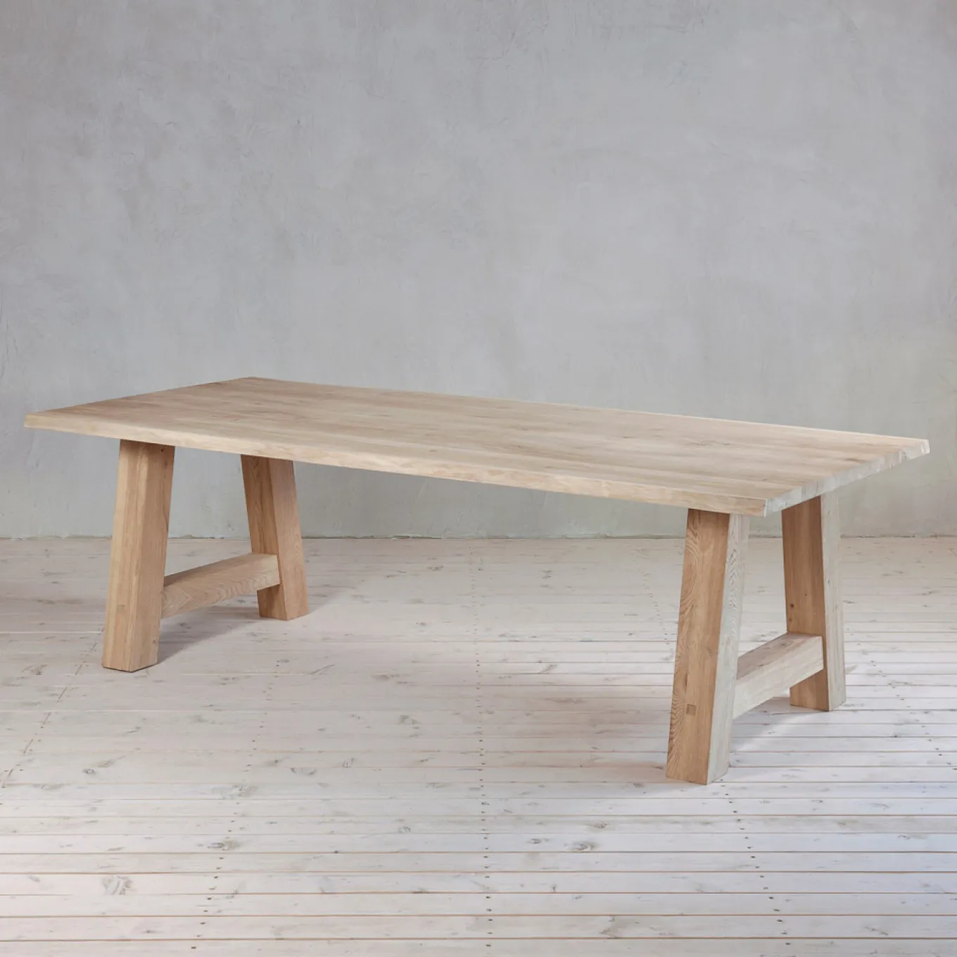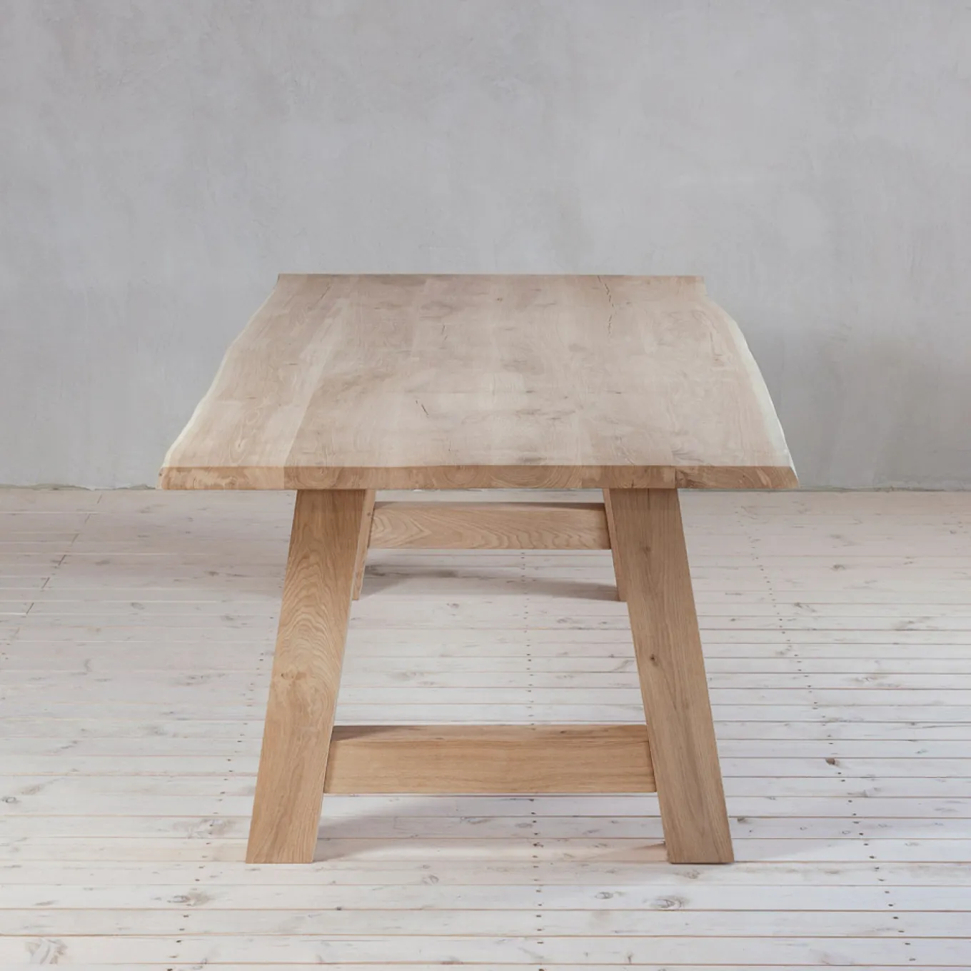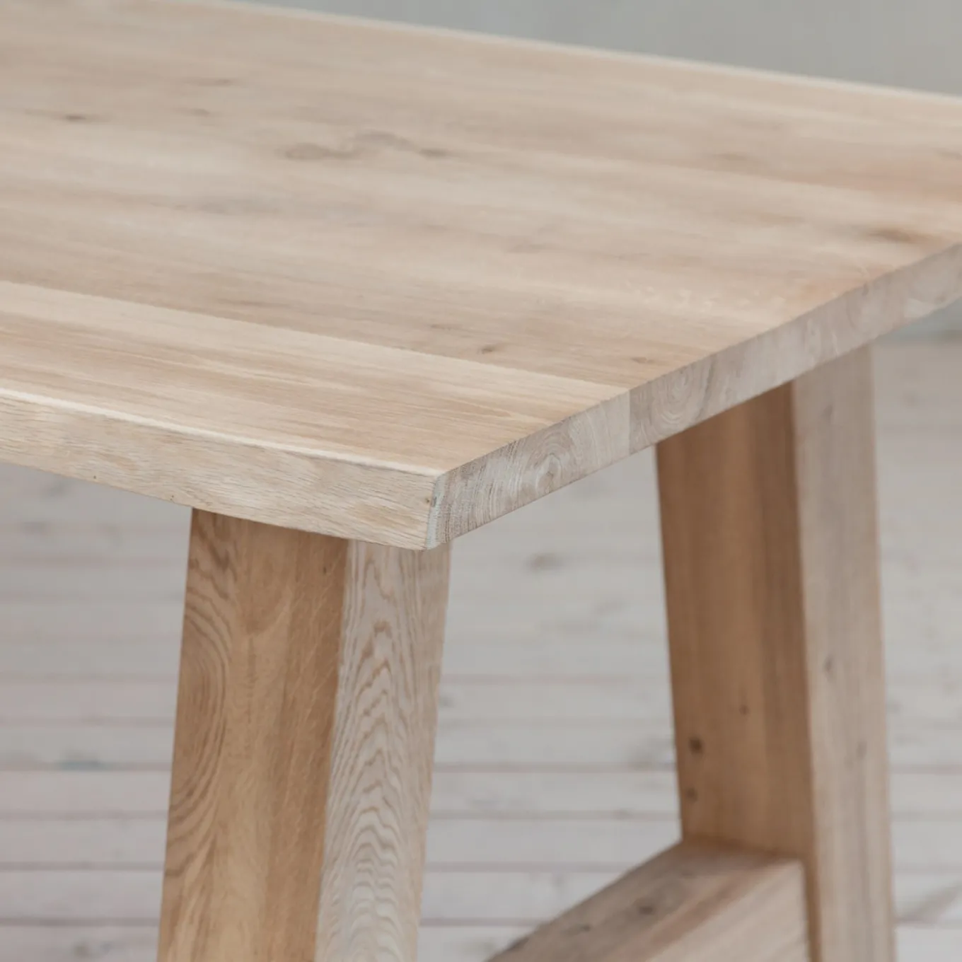 Das A-förmige Gestell aus Eiche lässt jede Tischplatte modern und gemütlich wirken. Jedes Gestell hat, durch das individuell gewachsene Holz, seinen eigenen Charme. So wird jeder Tisch zu einem Unikat und die Maße: H: 72 cm, B: 88 cm.