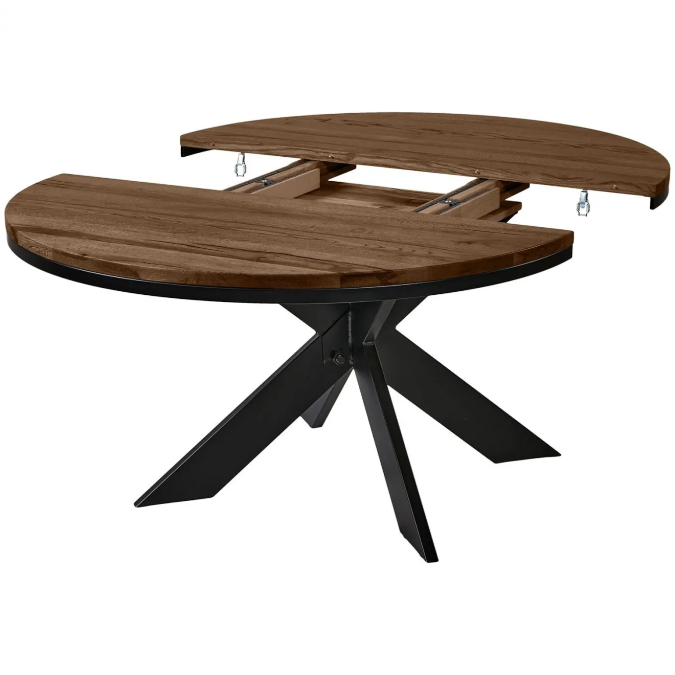 Dieser runde Esstisch von Bodahl aus massiver, rustikaler Eiche mit einem Gestell aus schwarzem Metall ist zeitlos und ein absolutes Verwandlungsgenie! Das robuste und stilvolle Design macht ihn zum Herzstück in jedem Esszimmer.