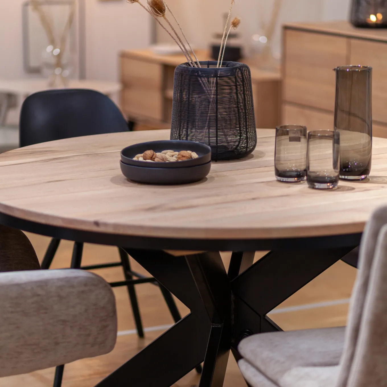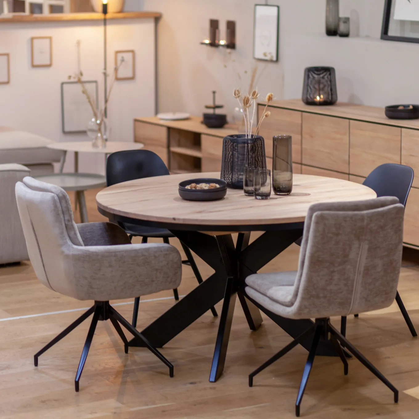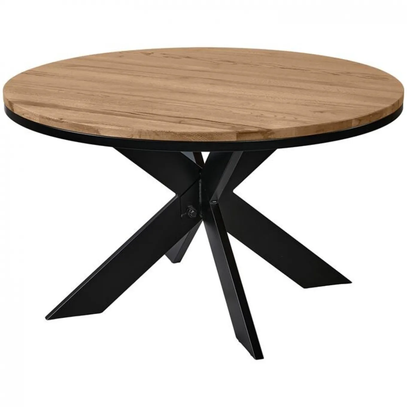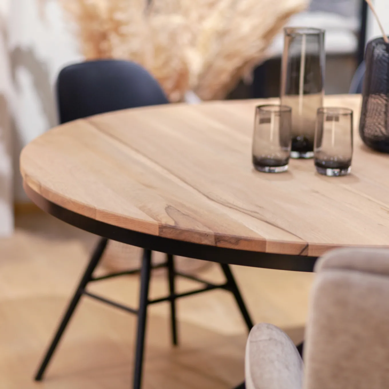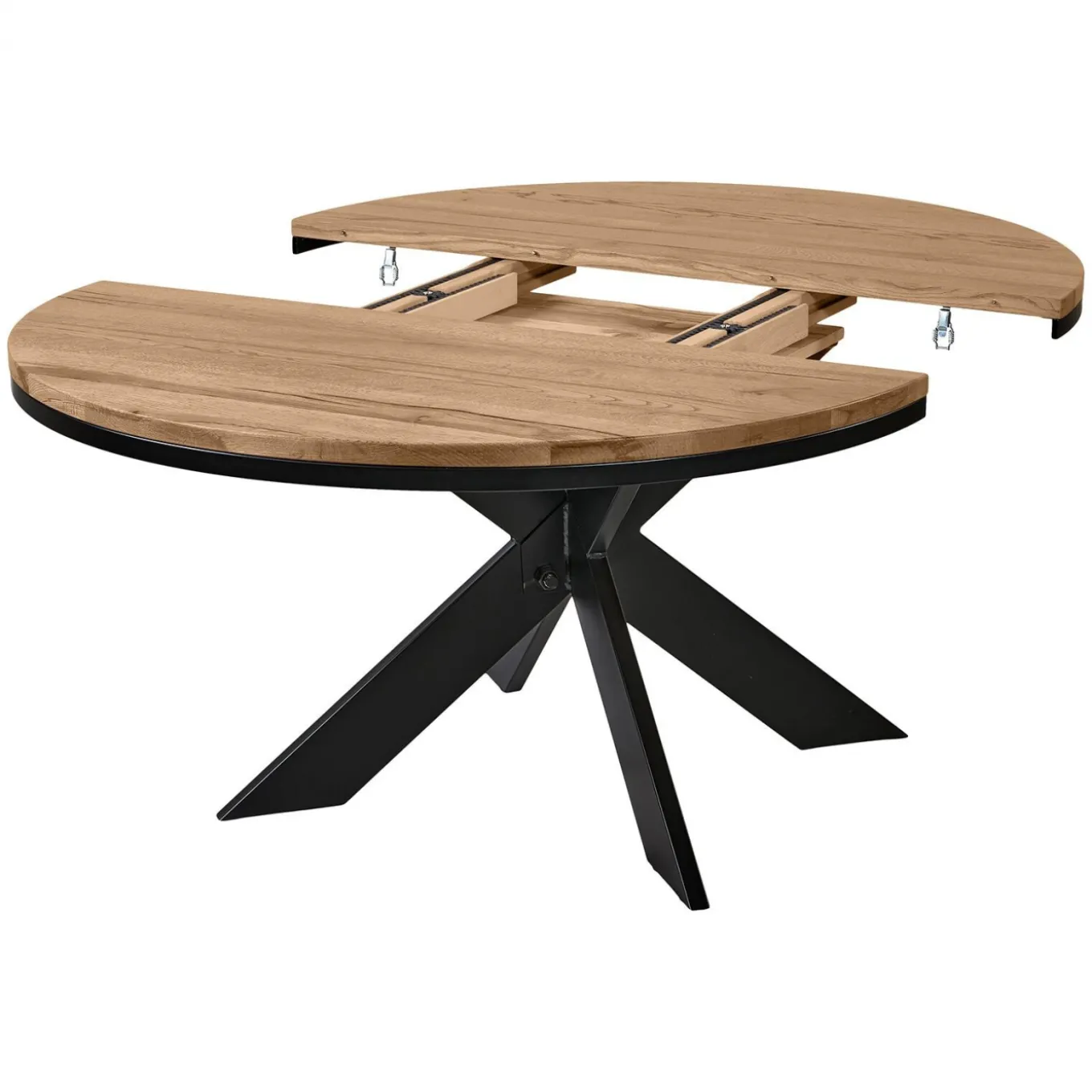 Dieser runde Esstisch aus massiver, rustikaler Eiche mit einem Gestell aus schwarzem Metall ist zeitlos und ein absolutes Verwandlungsgenie!