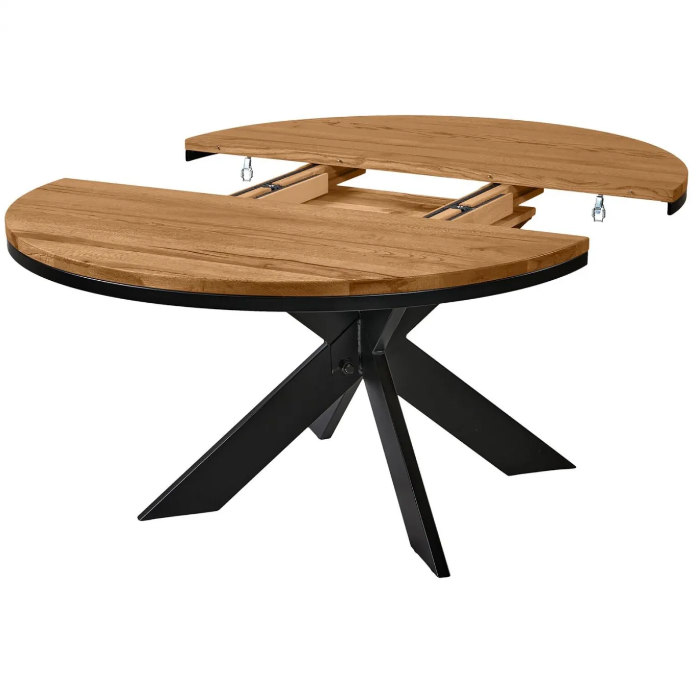 Dieser runde Esstisch von Bodahl aus massiver, rustikaler Eiche mit einem Gestell aus schwarzem Metall ist zeitlos und ein absolutes Verwandlungsgenie! Das robuste und stilvolle Design macht ihn zum Herzstück in jedem Esszimmer.