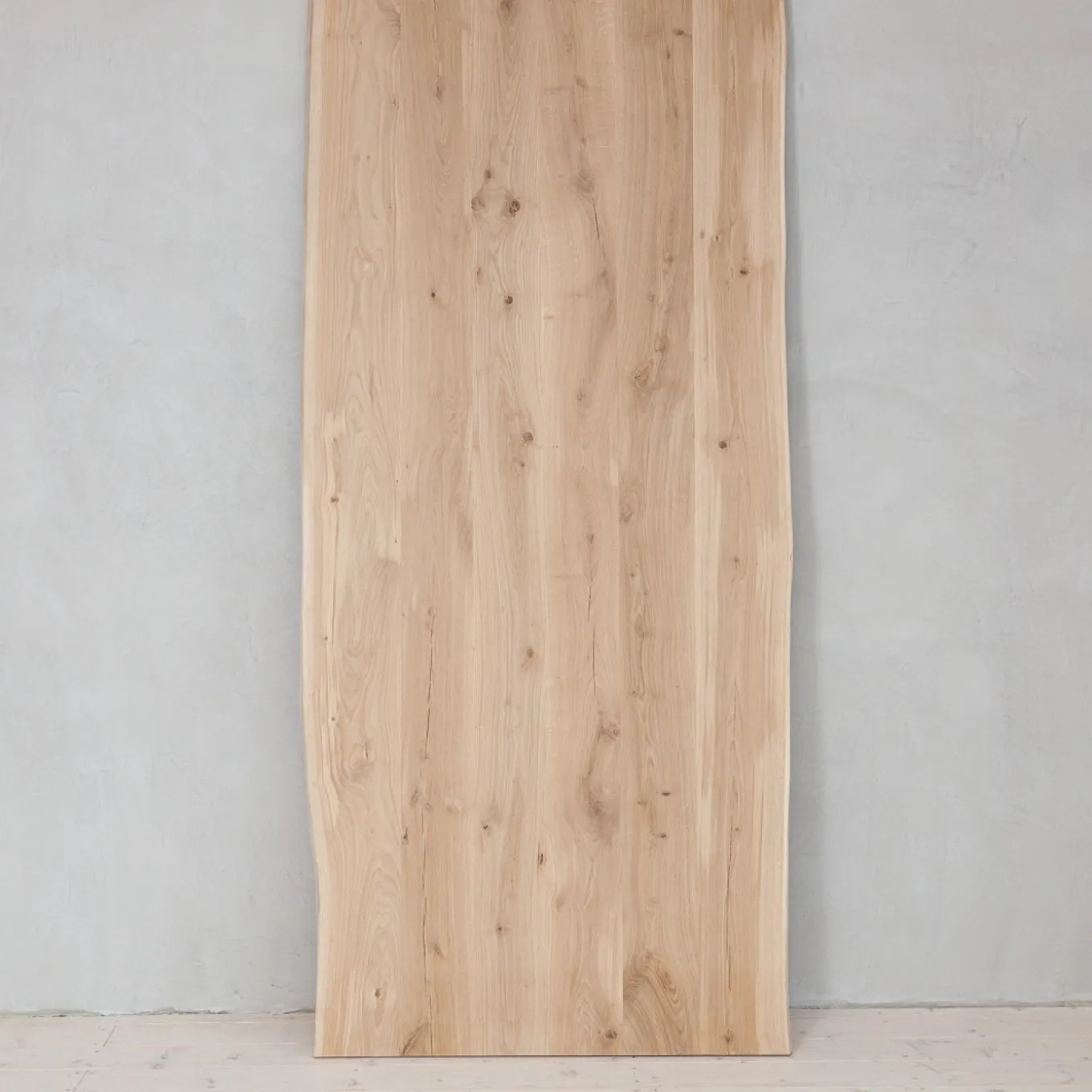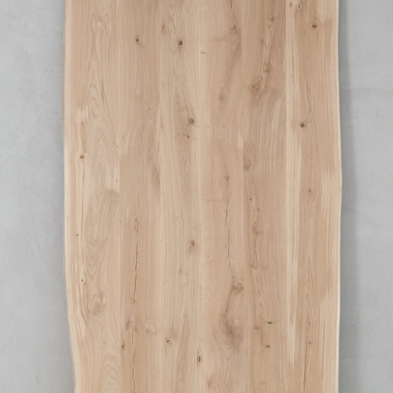 Diese Tischplatte aus Eiche ist massiv und robust. Die geschliffene Holzoberfläche verleiht der Tischplatte aus Massivholz einen natürlichen Look. Zudem wird vor allem lebendiges Holz verarbeitet: Äste, Risse, Hobelschläge und Unebenheiten machen die Tischplatte zu einem Unikat. Das Besondere an dieser Tischplatte: glatte, natürlich geformte Baumkanten schließen die Tischseiten ab – das macht die Holzplatte noch lebendiger. Der robuste Charakter entsteht vor allem durch größere Äste, Kernrisse und vereinzelte Splintstreifen. Die ausgewählten Lamellen haben fallende Breiten. Die Tischplatte hat eine Stärke von ca. 4 cm.