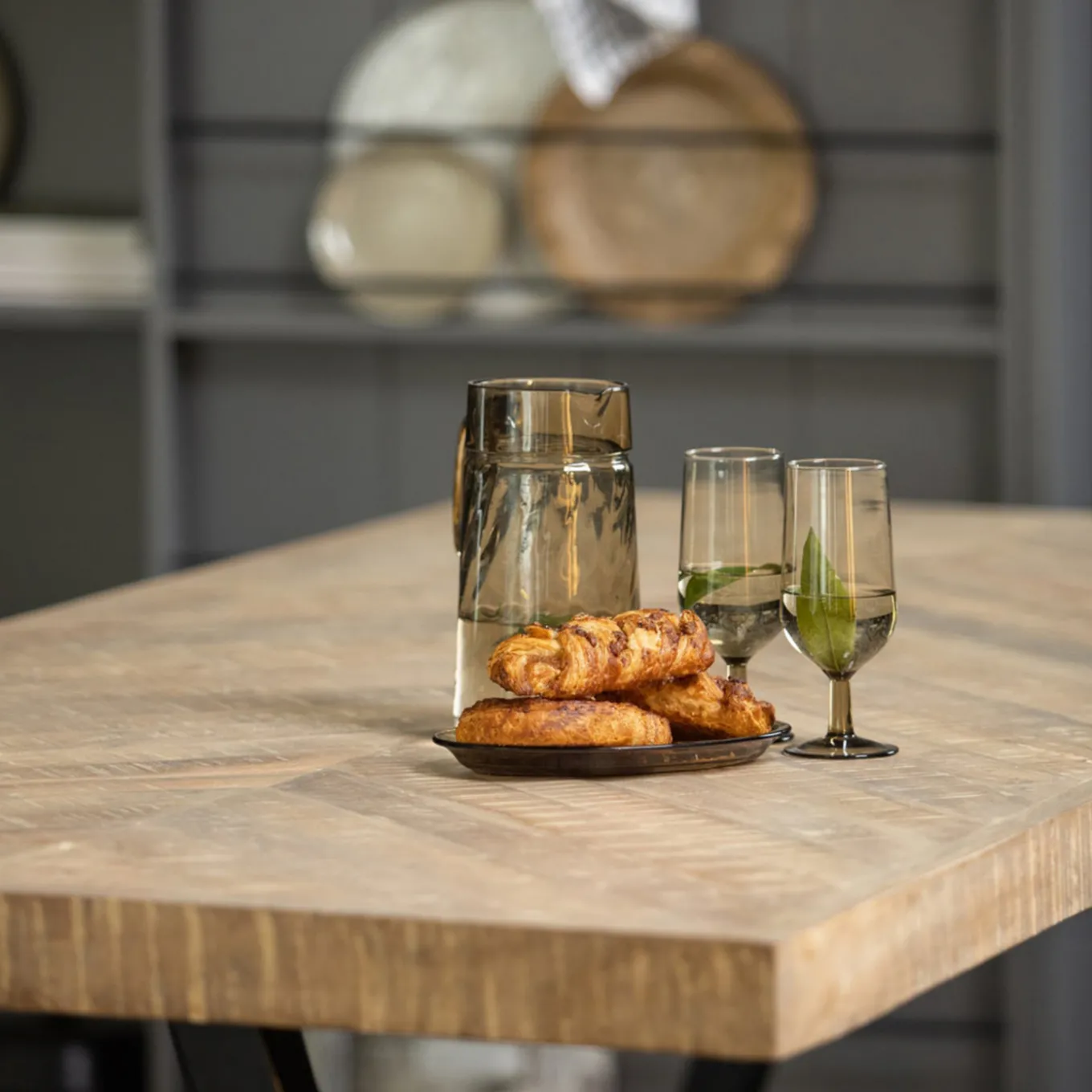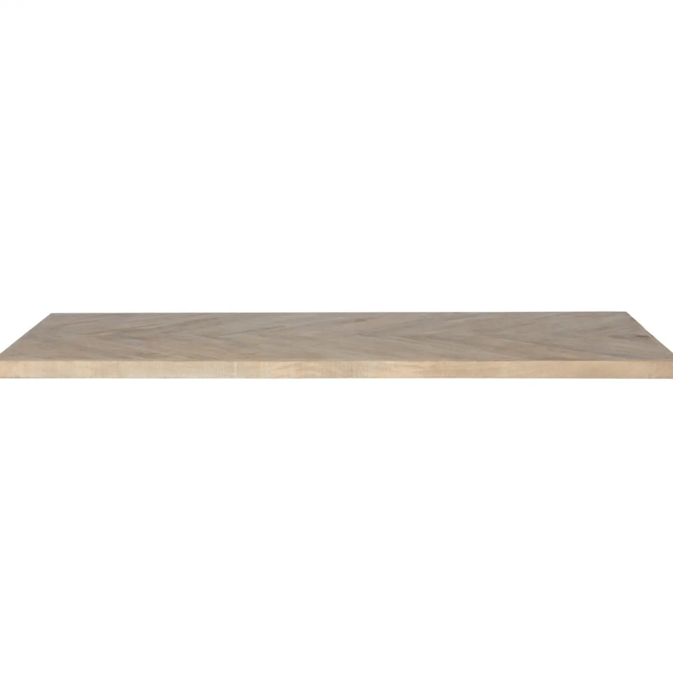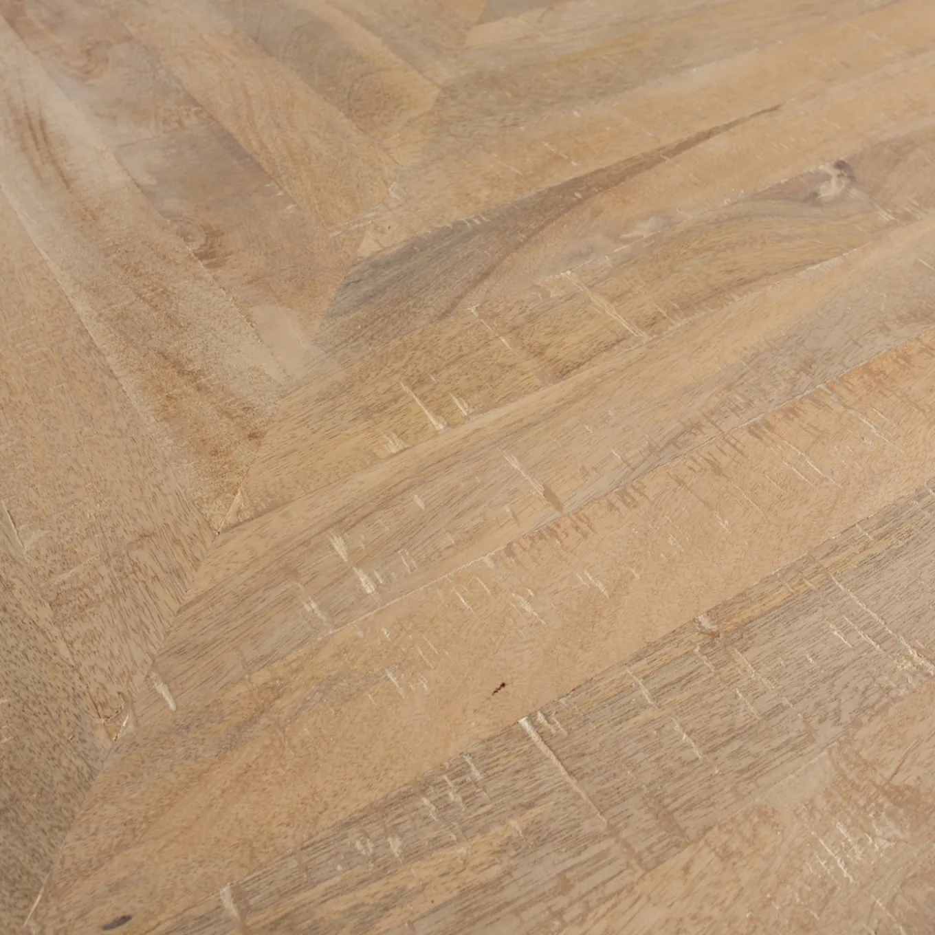 Das spezielle Finish verleiht dem Mangoholz eine weiße Waschschicht, die das Fischgrätenmuster noch besser zur Geltung bringt und das Gesamtbild des Holzes verstärkt. Diese Veredelung sorgt dafür, dass die Platte stabil und robust wirkt, gleichzeitig jedoch ein leichtes und modernes Erscheinungsbild behält.