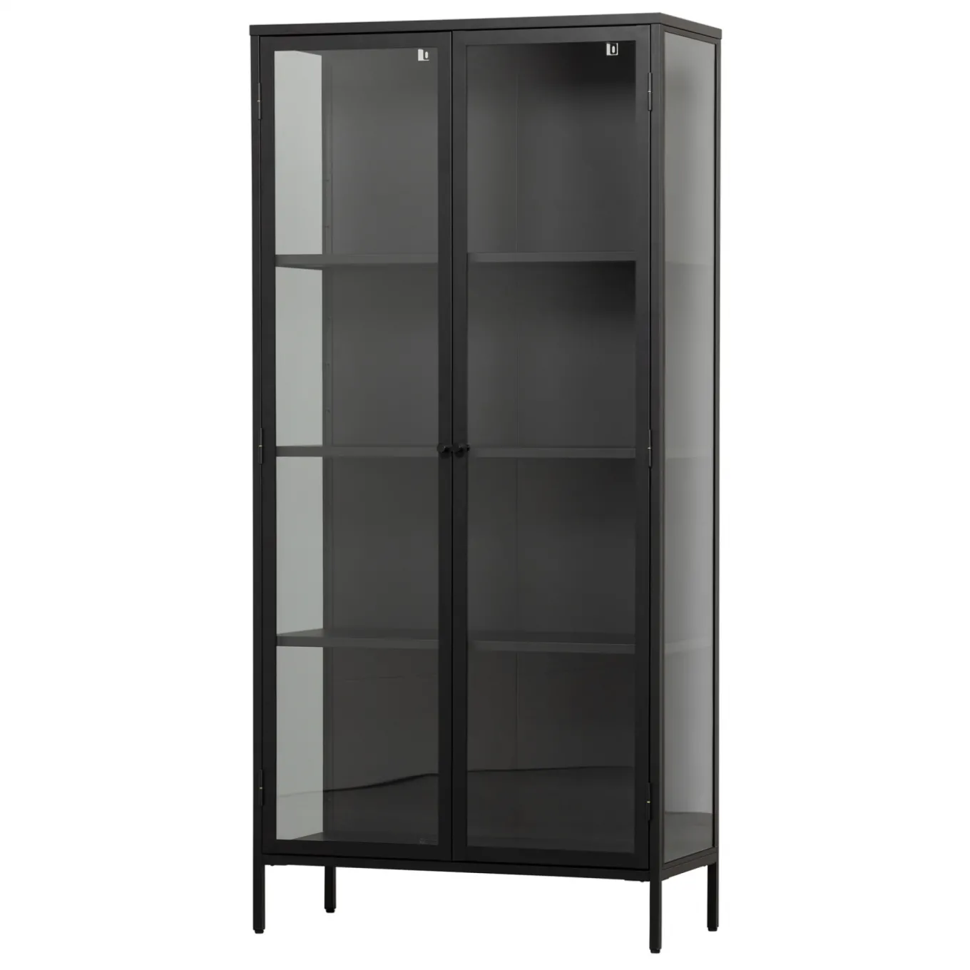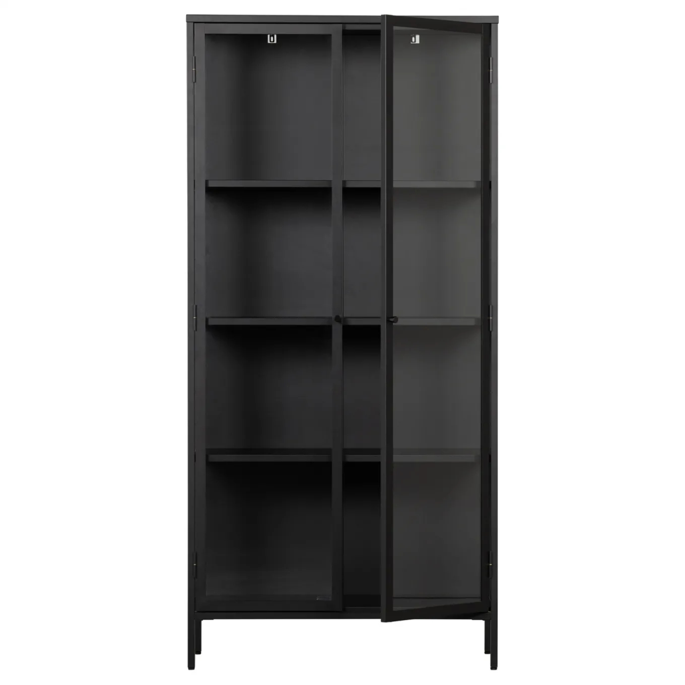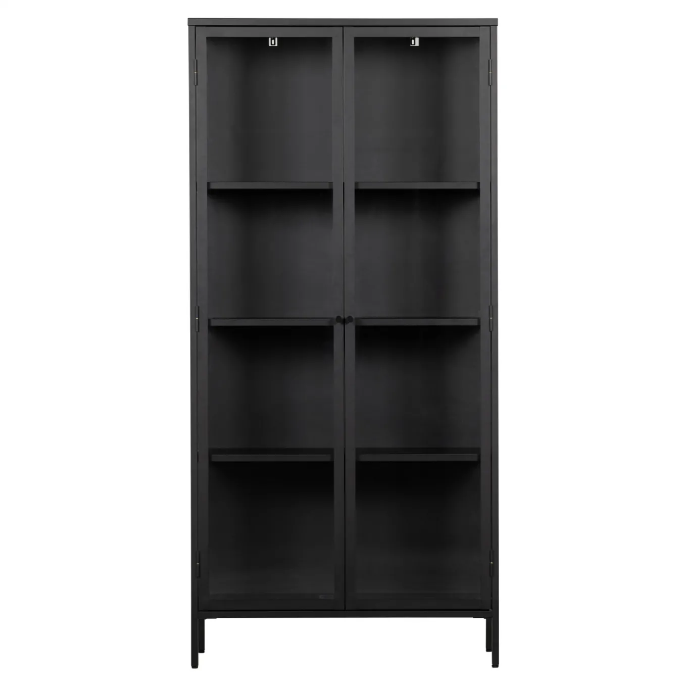 Setze mit dieser Vitrine im skandinavischen Look einen wunderschönen Akzent im Wohnzimmer, Esszimmer oder in der Küche. Die Vitrine ist aus schwarzem Eisen in matter Optik hergestellt. Der Look ist minimalistisch und urban! Die Schranktüren sind aus schwarzem Metall mit gehärtetem Glas hergestellt und verfügen über zwei kleine Handknöpfe. In der großzügigen Vitrine ist auf vier Einlegeböden Platz für dein Lieblingsgeschirr, Sammler- oder Erinnerungsstücke, hübsche Vasen, festliche Gläser, Fotos und noch viel mehr…