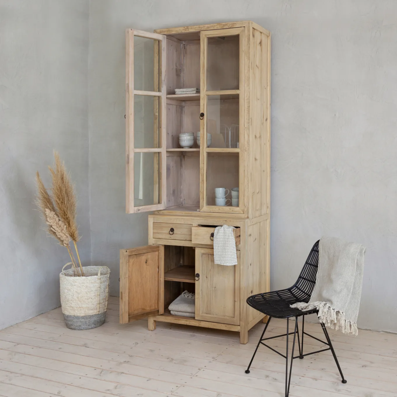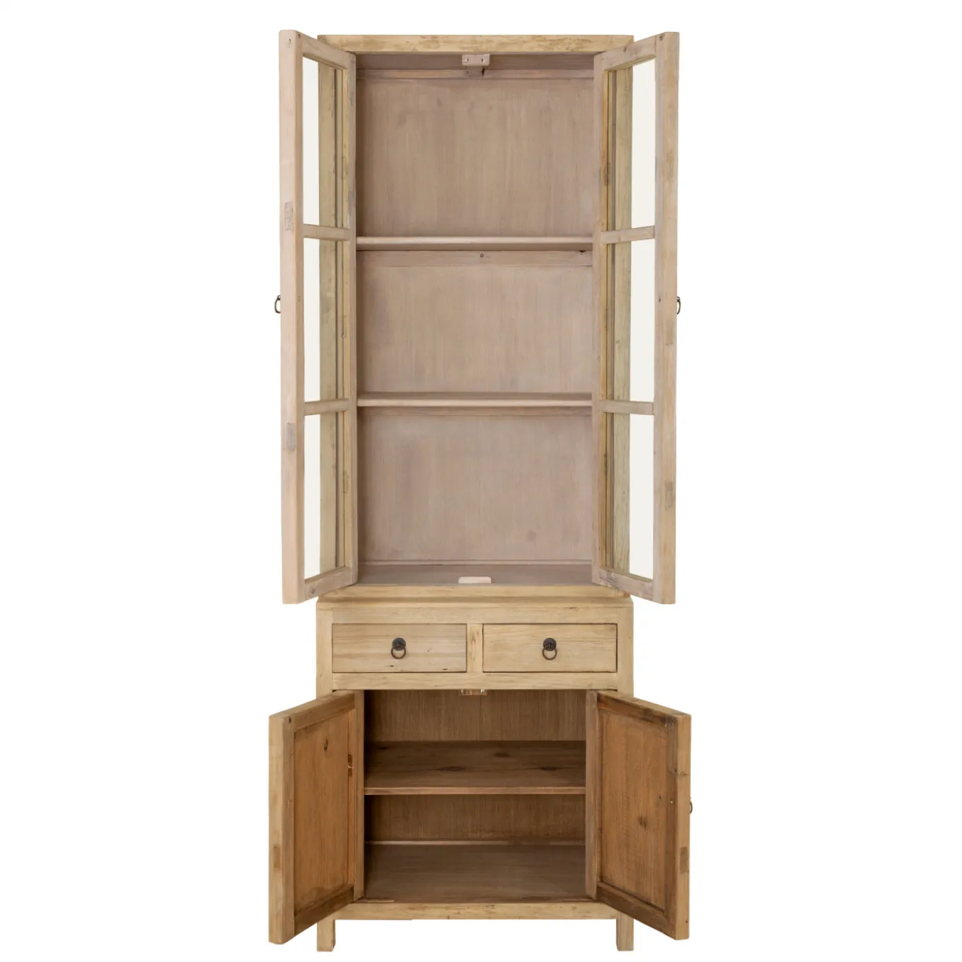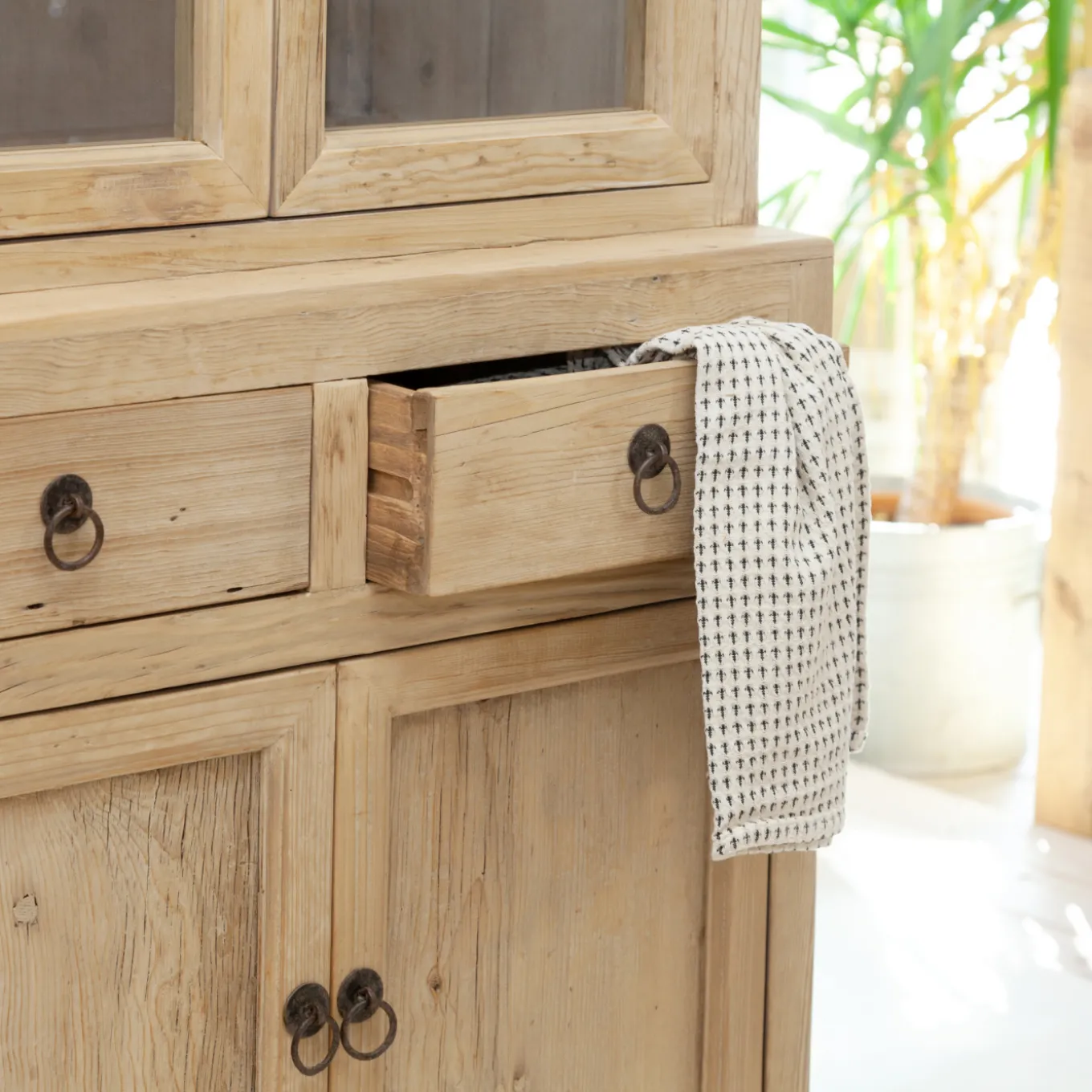 In dieser massiven Vitrine aus Kiefernholz kannst du deine Lieblingsdinge präsentieren und hast dazu noch reichlich Stauraum für Dinge, die nicht jeder sehen soll. Diese Vitrine im Landhausstil bietet auf drei Ebenen Platz für dein Lieblingsgeschirr, Sammler- oder Erinnerungsstücke, hübsche Vasen, festliche Gläser, Fotos und mehr. Drei Schubladen und zwei Türen bieten zusätzlichen Stauraum für Geschirr, Textilien und andere Kleinigkeiten. Die Schubladen und Türen lassen sich mit eleganten, schwarzen Ringen öffnen.