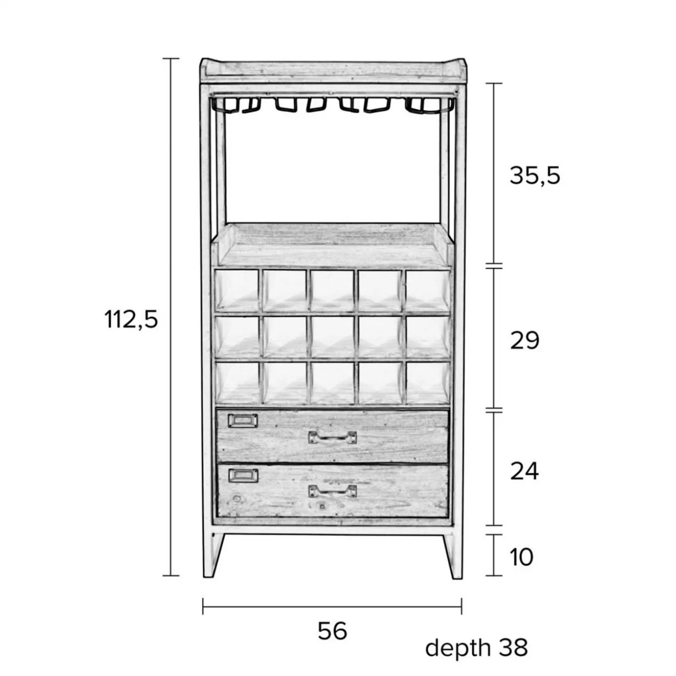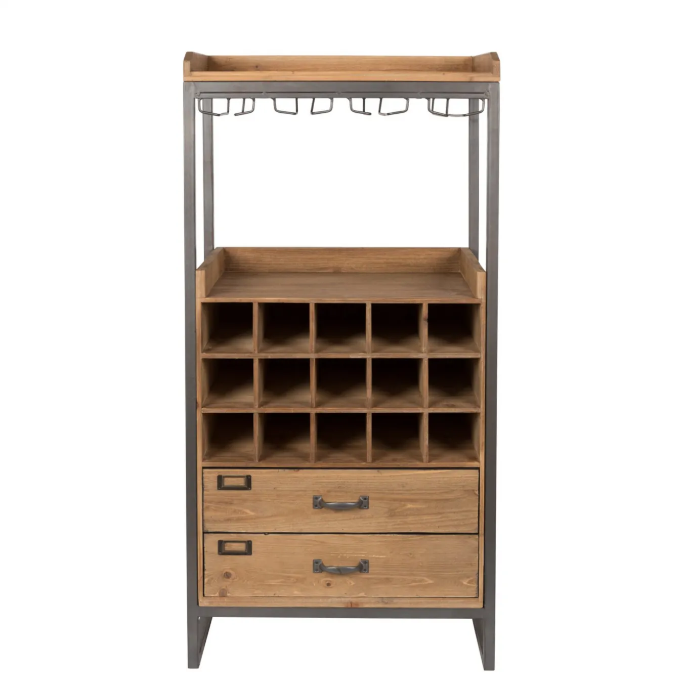 In diesem charmanten Weinregal ist Platz für deine Lieblingsweine. Der lässige Materialmix aus Holz und Metall sorgt für den unverwechselbaren Charme! Das Regal im Industrial Look bietet mit 15 Weinfächern genügend Lagerraum für deine Weine. Auch die passenden Gläser sind gleich zur Hand und können dekorativ aufgehangen werden. Weitere Utensilien wie Flaschenöffner, Weinlektüre und Co. können einfach in der Schublade verstaut werden. Auch für den Dekantierer ist Platz auf der Ablagefläche. Bei dem modernen und robusten Weinregal wurde also an alles gedacht… Einem genussvollen Vino-Abend mit Freunden steht also nichts mehr im Weg!