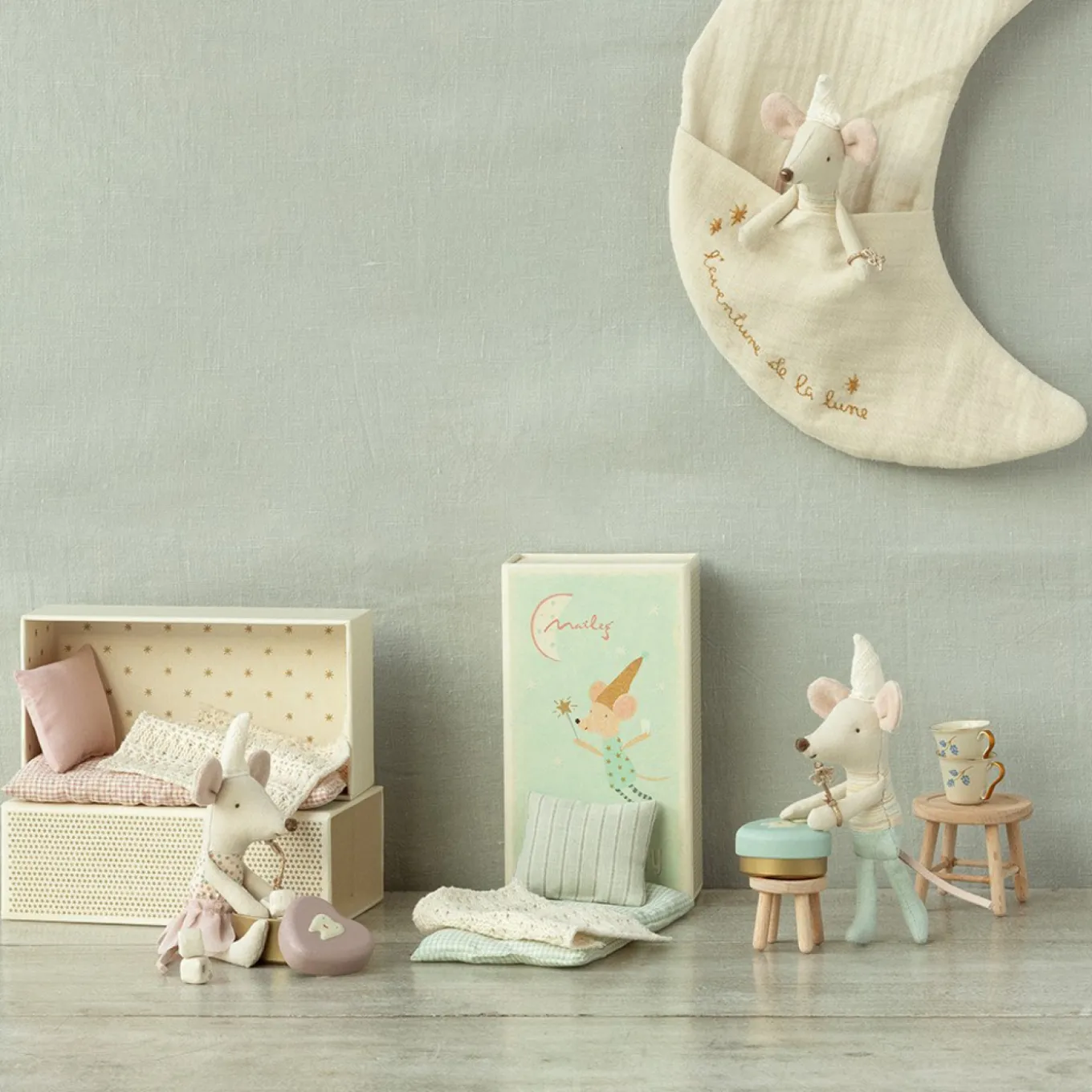 Nachts schwebt die Zahnfee-Maus durch die Träume der Kleinen, verteilt Feenstaub, sammelt Zähne und bringt kleine Überraschungen. Mit ihrem liebevoll gestalteten Outfit und ihrer weichen Bettwäsche sorgt sie für magische Nächte und süße Träume.